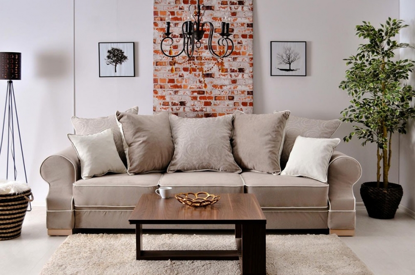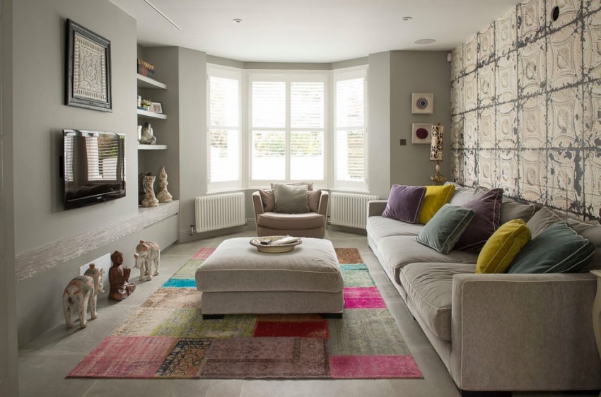 Contoh gabungan warna yang betul kertas dinding di ruang tamu menggunakan kanvas pelbagai warna dan tekstur