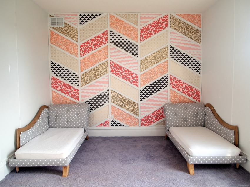 Kaedah perekatan yang paling mudah adalah kaedah gantian bahan, menyebarkannya di sepanjang dinding dengan kanvas atau dalam bentuk segmen dalam pola papan catur. Selain itu, kertas dinding dengan gambar yang dicetak dapat digunakan untuk menghiasi satu permukaan aksen. Pilihan penggunaan dinding berpasangan diperbolehkan: dua permukaan ditampal dengan kanvas biasa, selebihnya dua berpola.