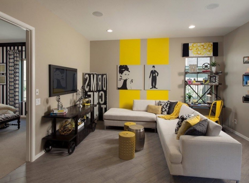 Dengan gabungan kertas dinding berwarna putih dan berwarna, anda boleh menekankan atau menyembunyikan ciri susun atur ruang tamu