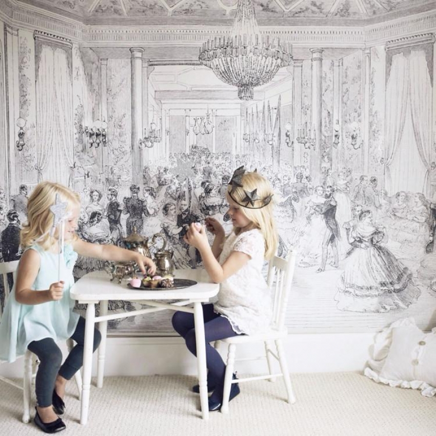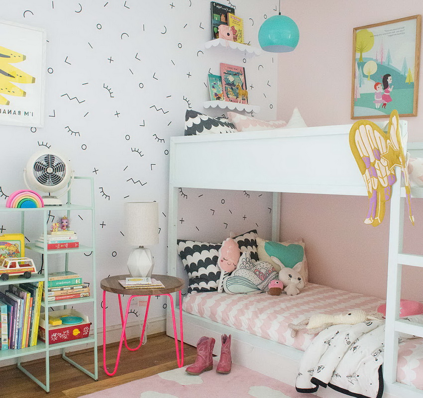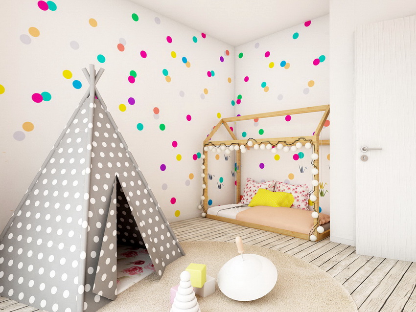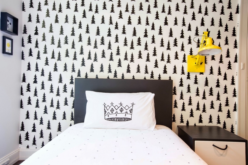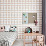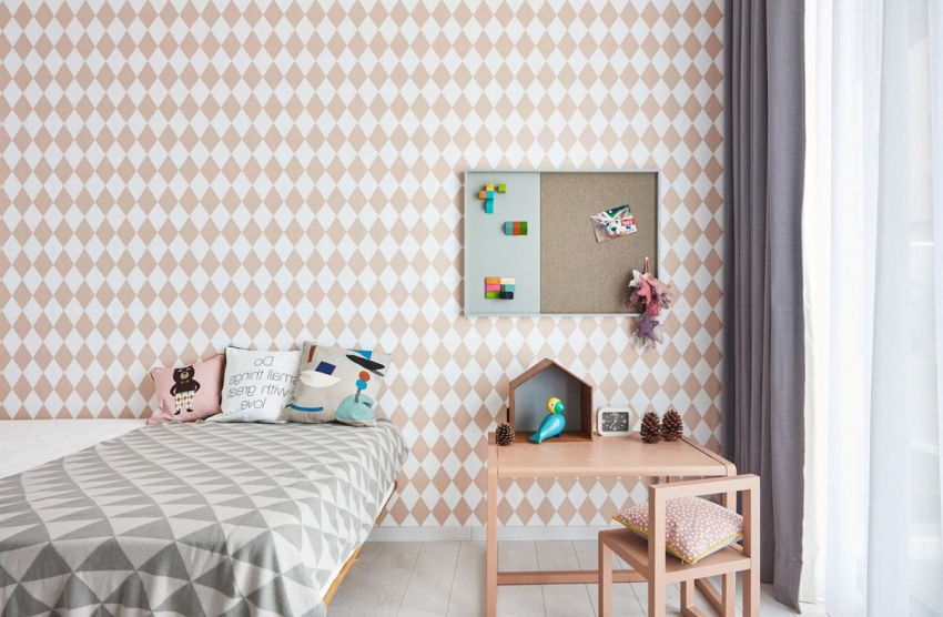 Untuk bilik kanak-kanak, penting untuk menggunakan kertas dinding dengan corak halus tetapi menarik.