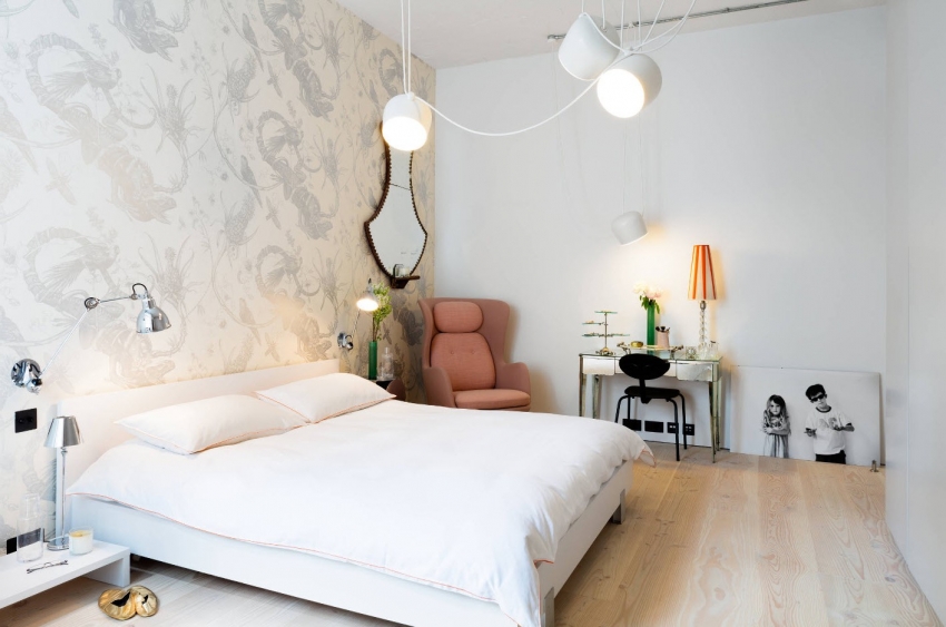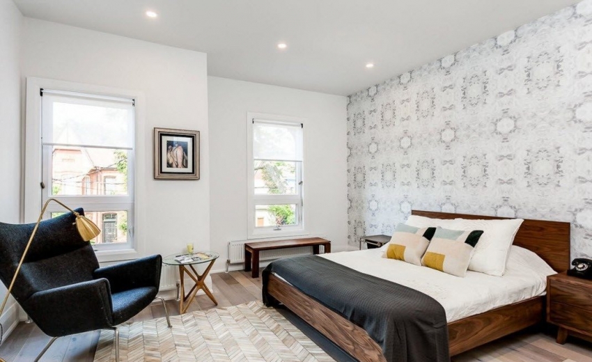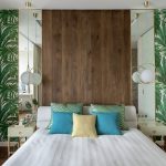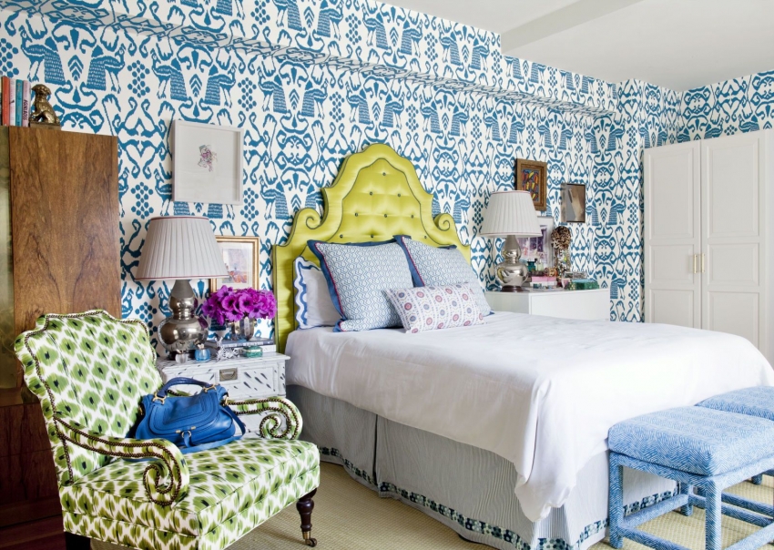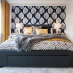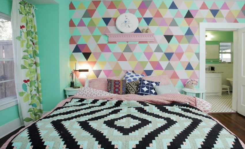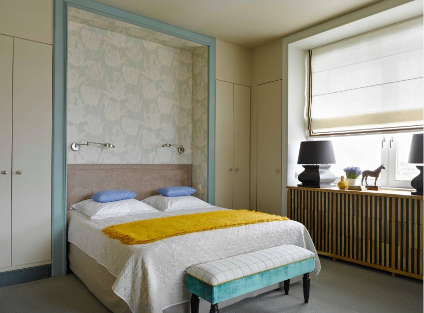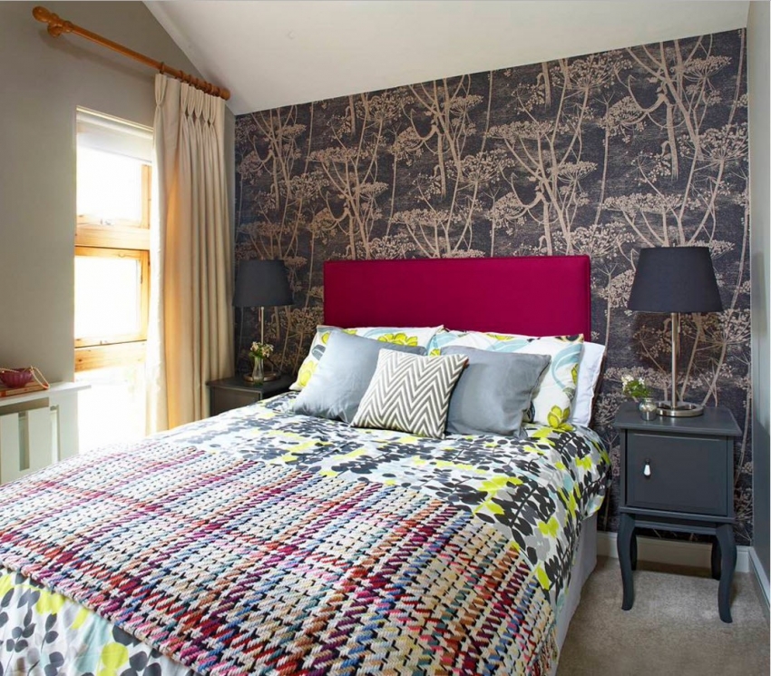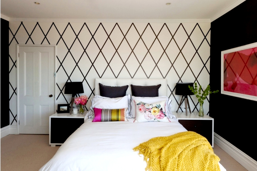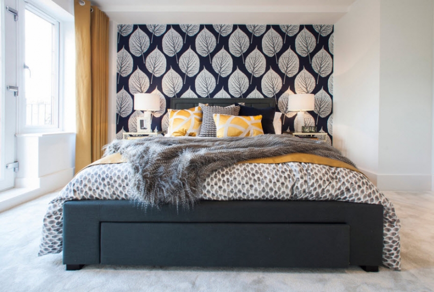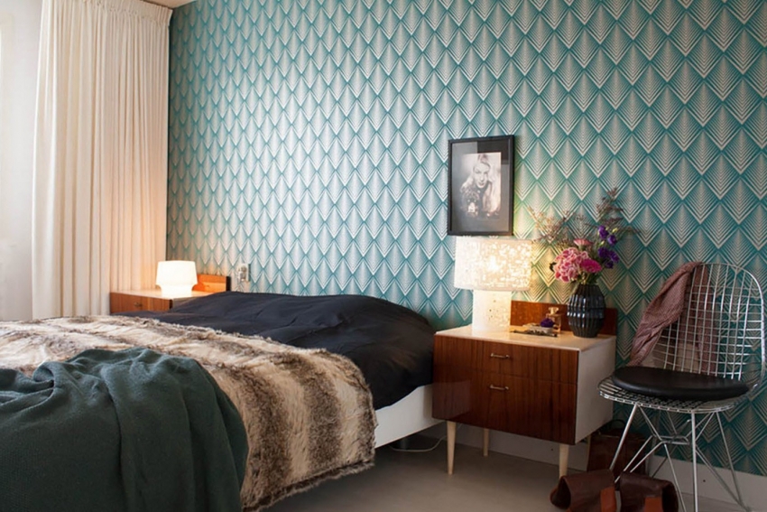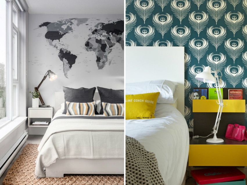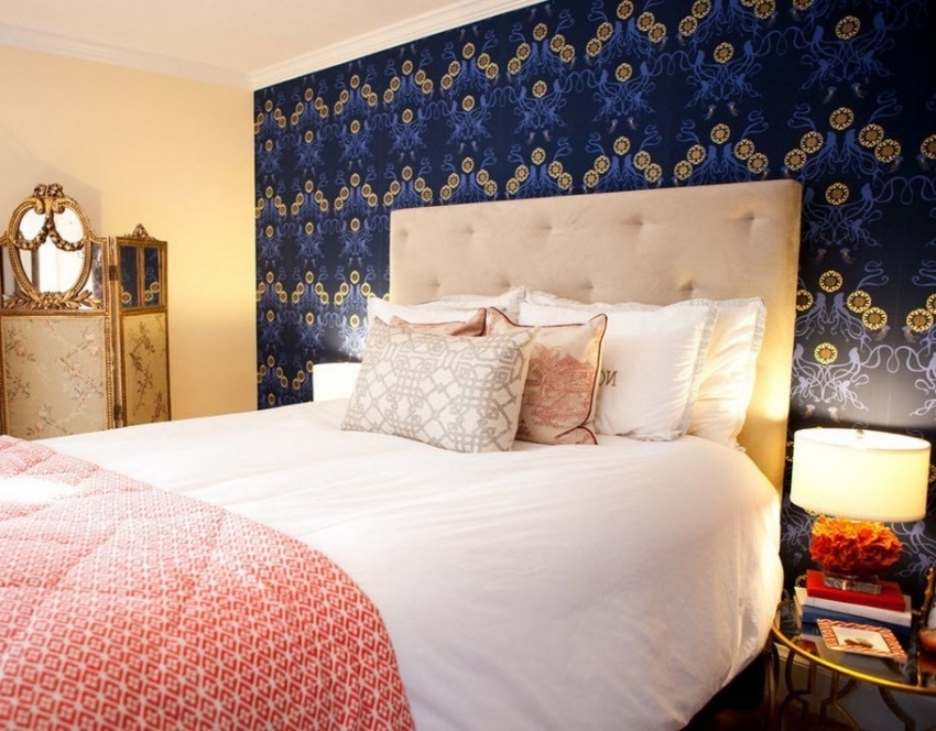 Dinding aksen di bilik tidur dapat diserlahkan dengan kertas dinding dengan corak atau hiasan yang terang.