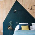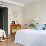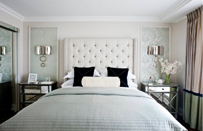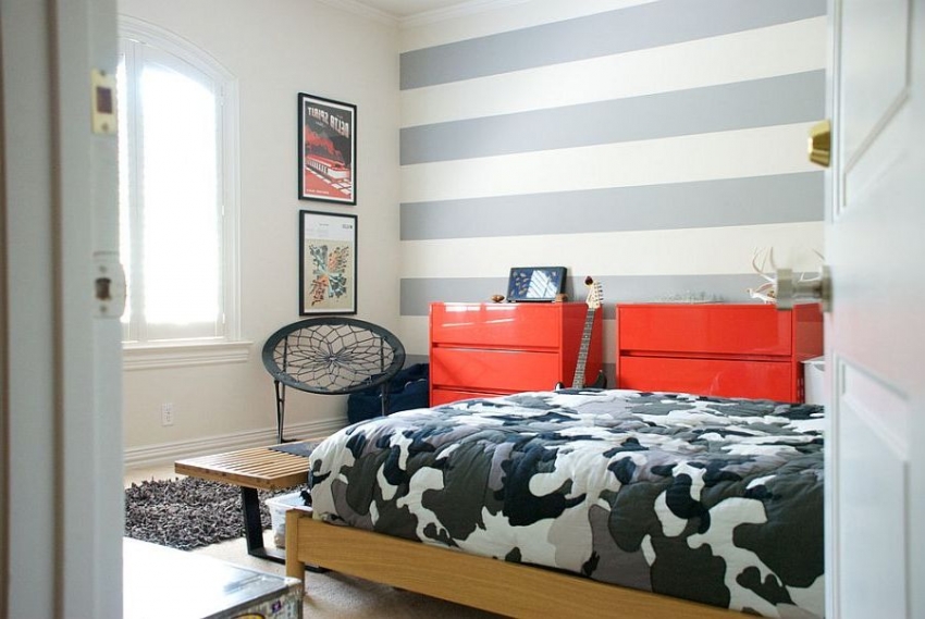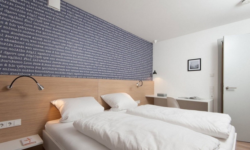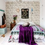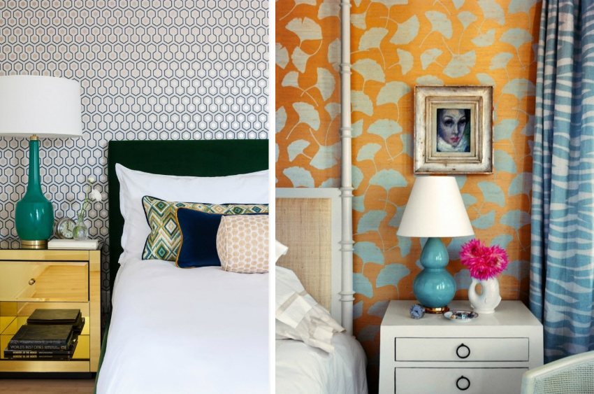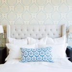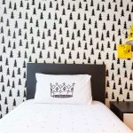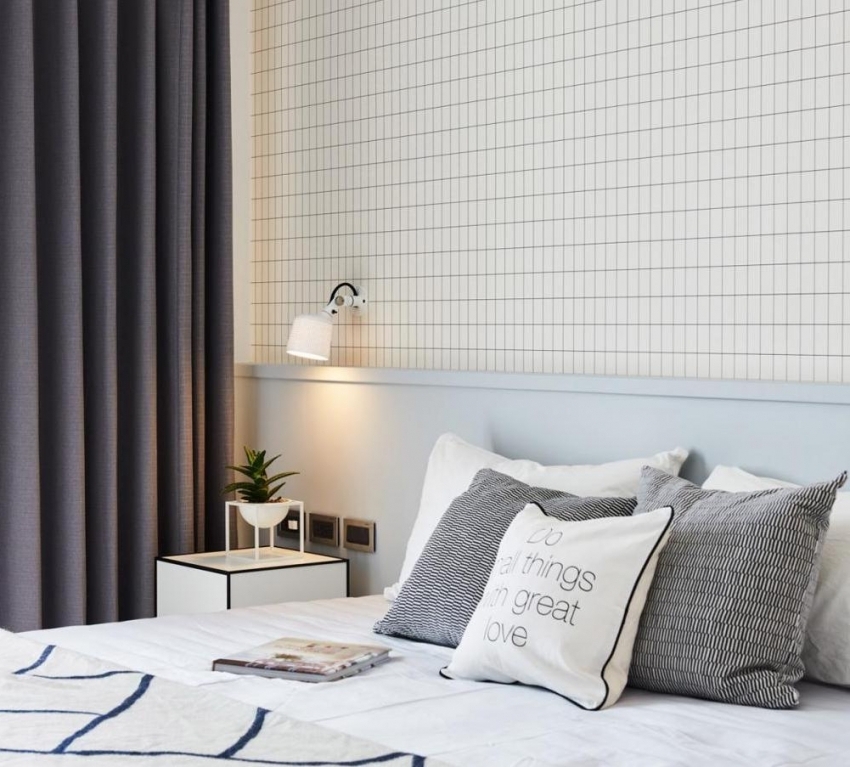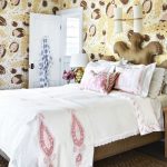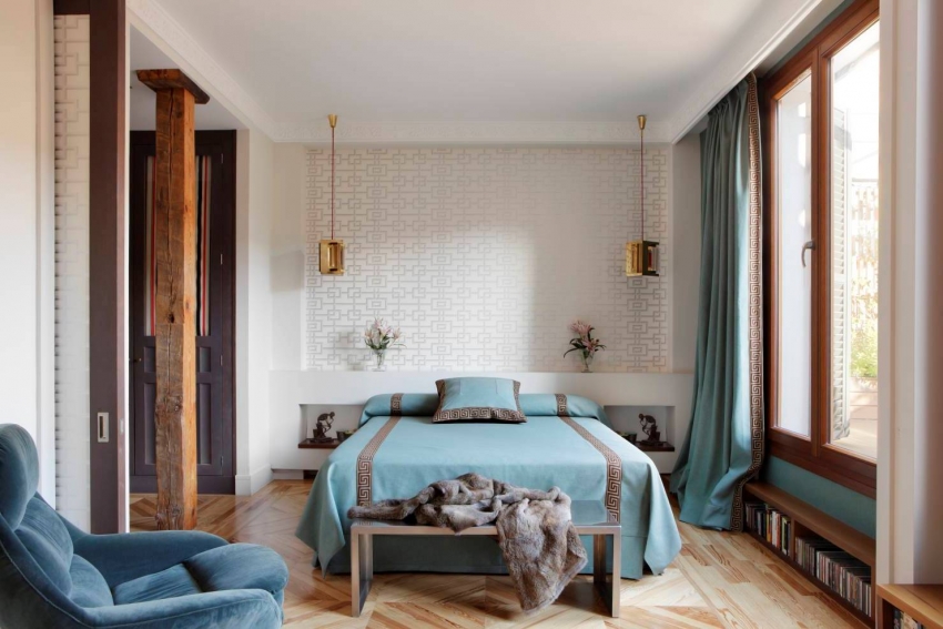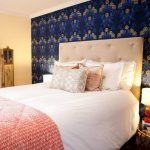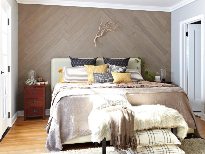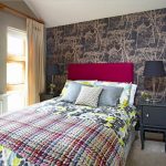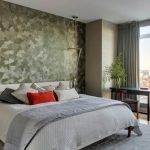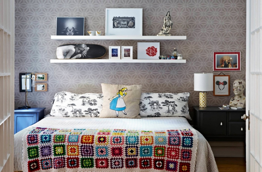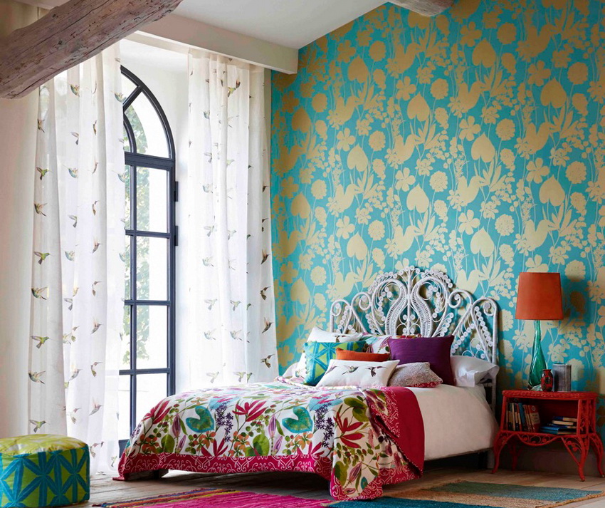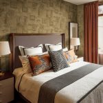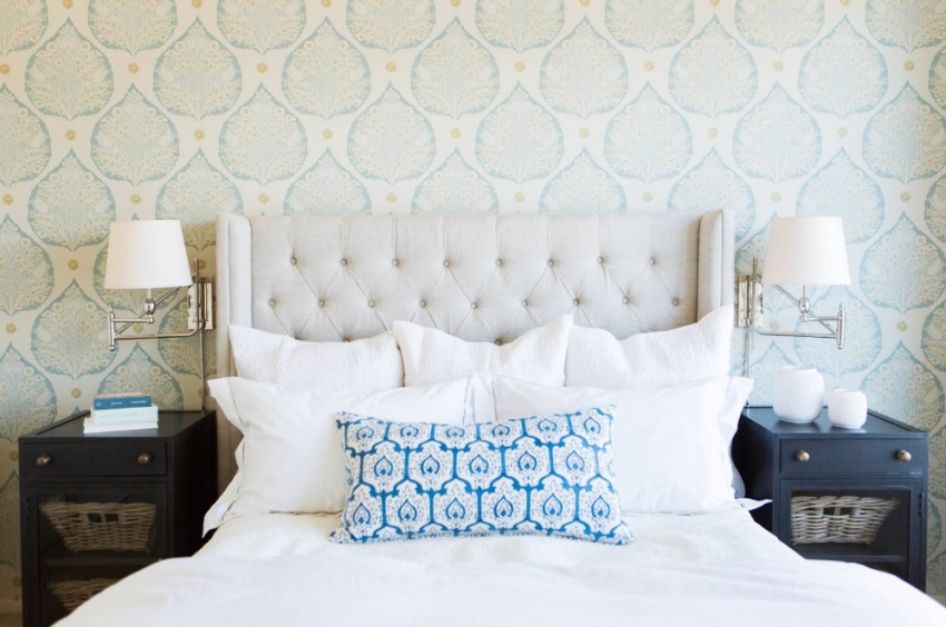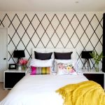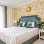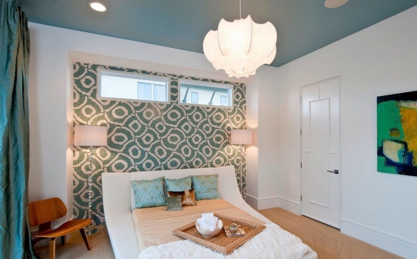 Dinding aksen di bilik tidur dapat diserlahkan dengan kertas dinding dengan corak atau hiasan yang terang.
