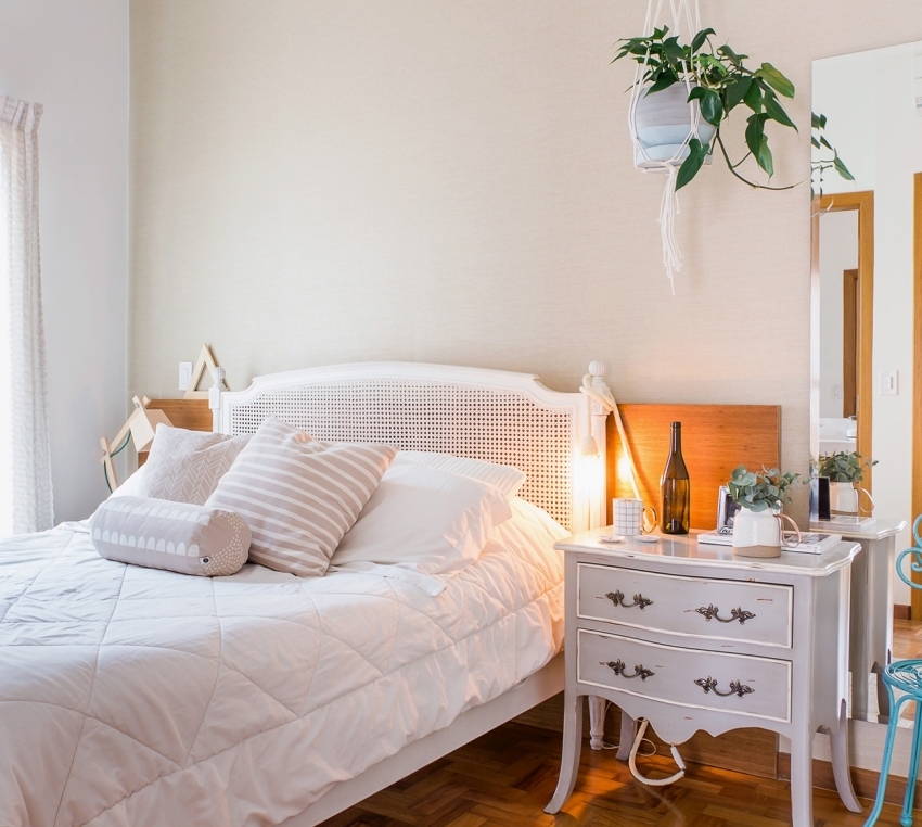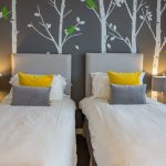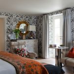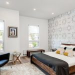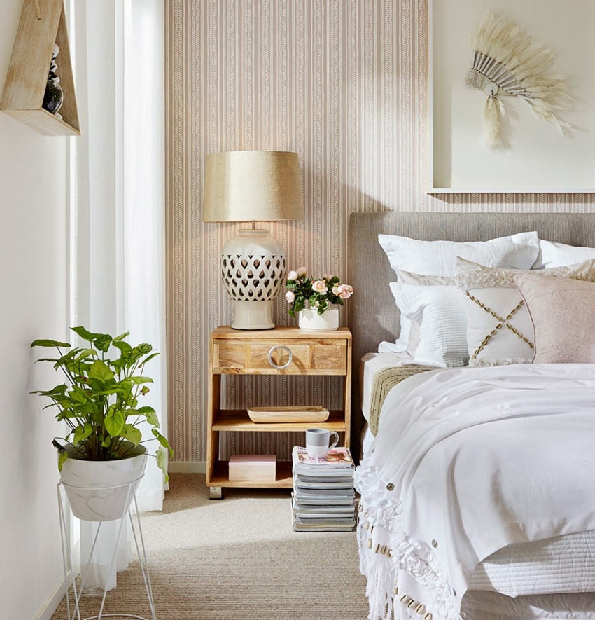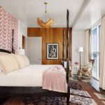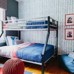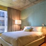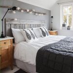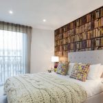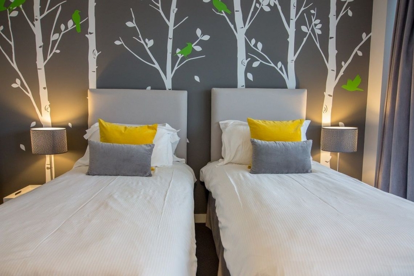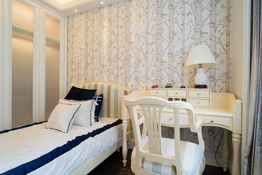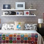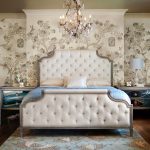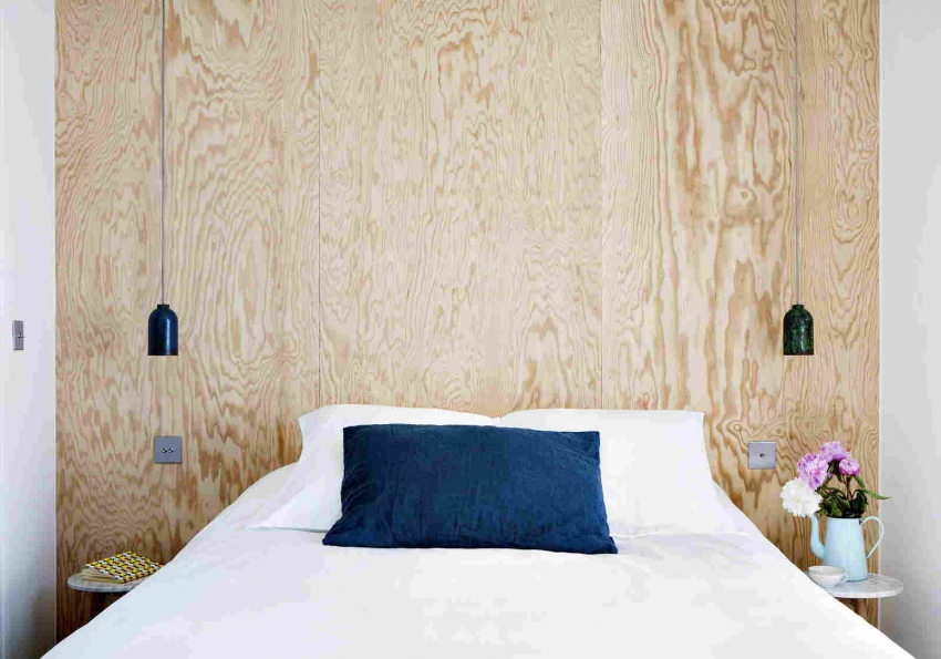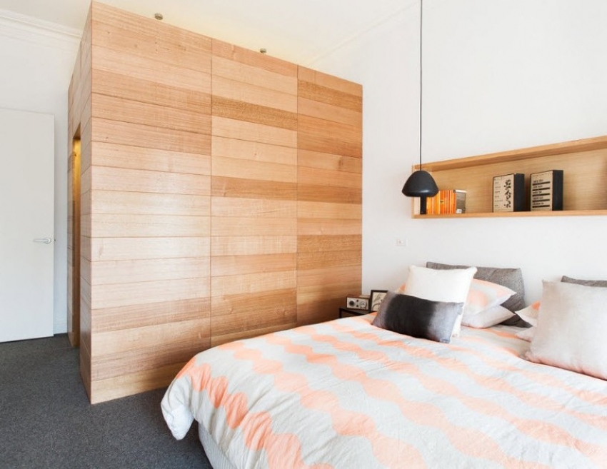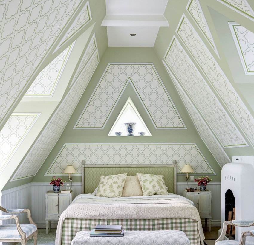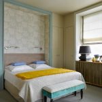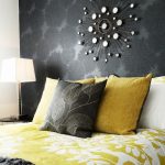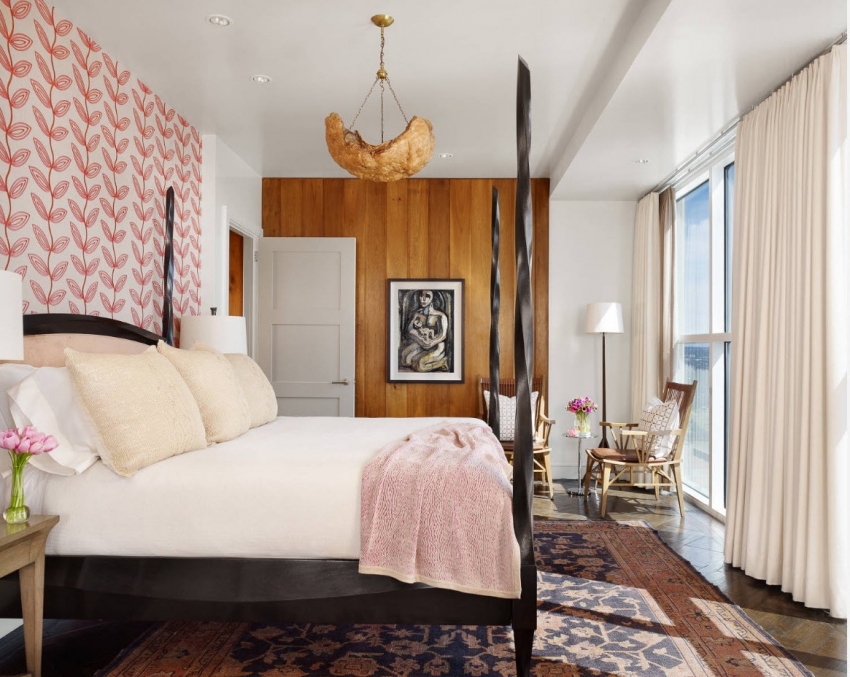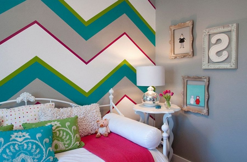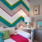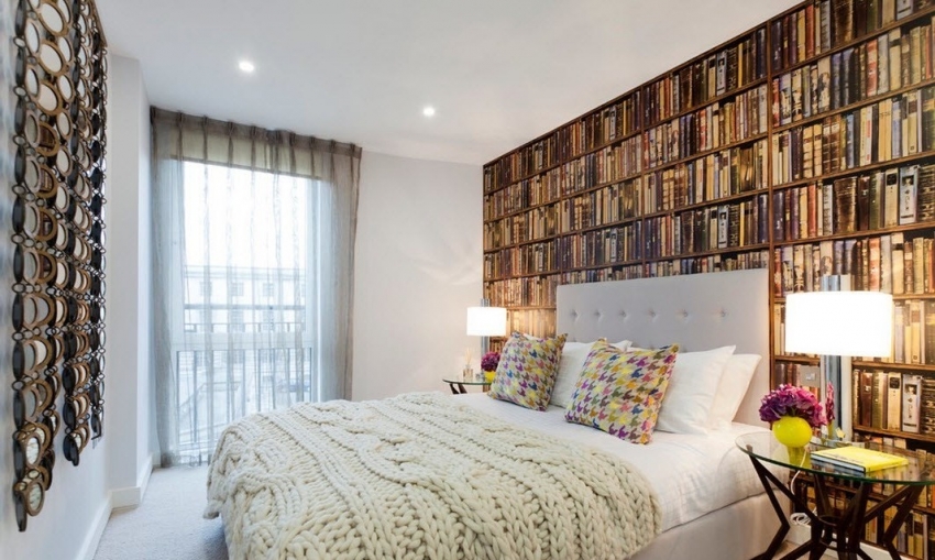 Dinding aksen di bilik tidur dapat diserlahkan dengan kertas dinding dengan corak atau hiasan yang terang.