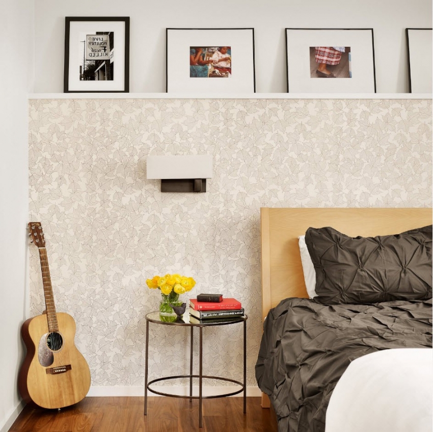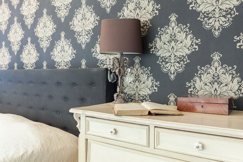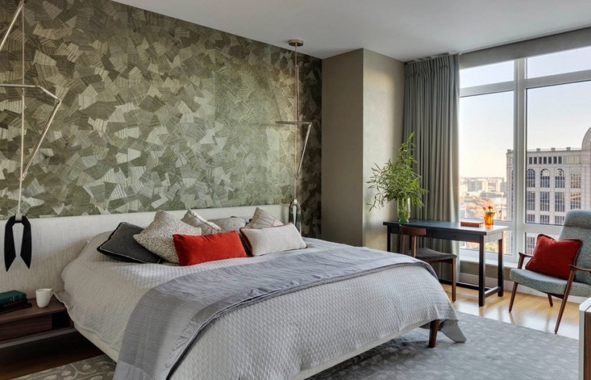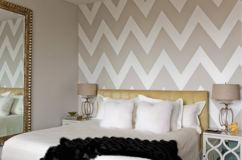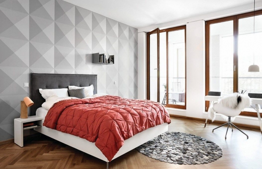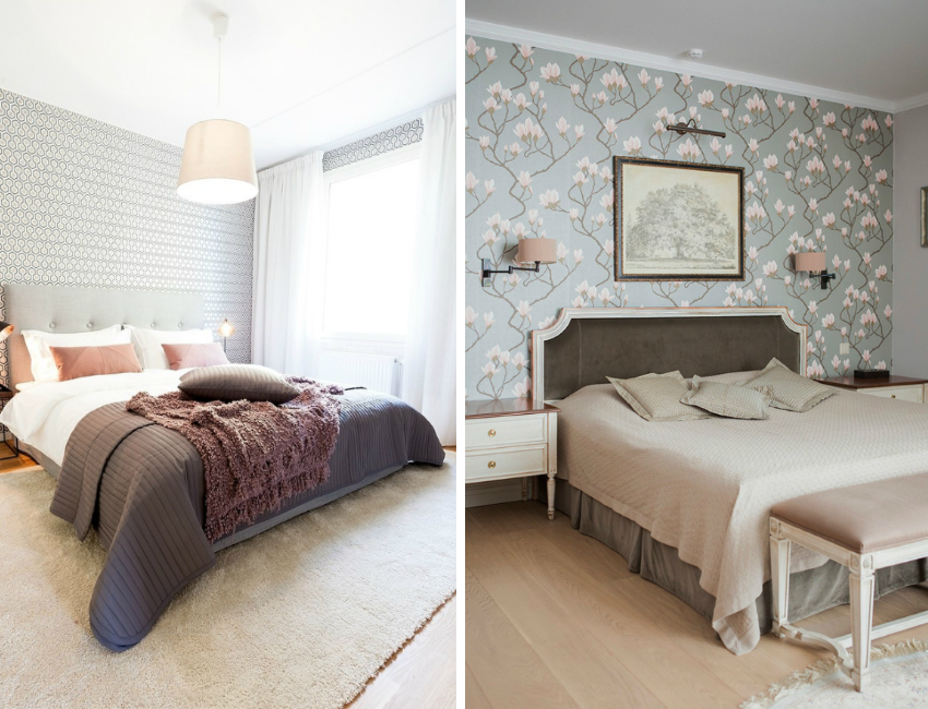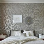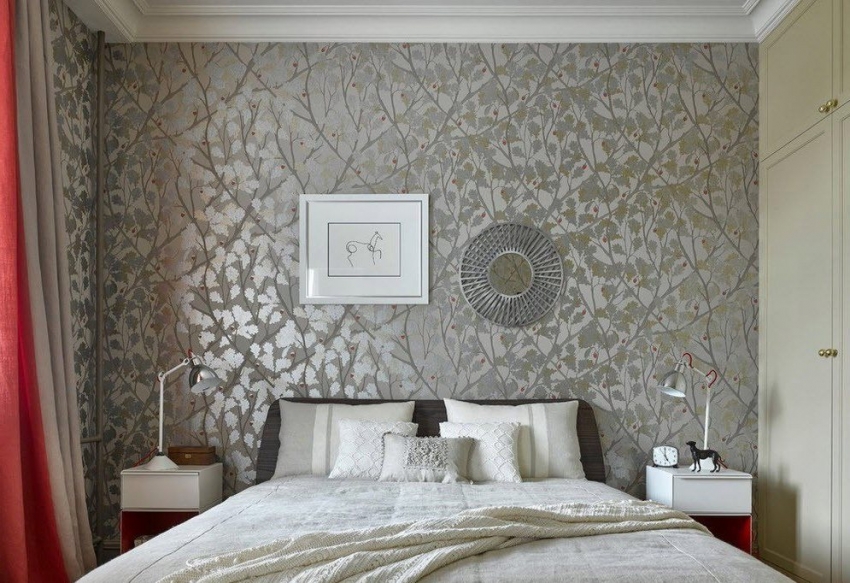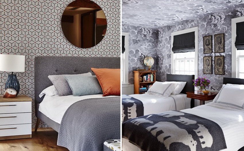 Untuk bilik tidur, anda boleh menggunakan kertas dinding dalam warna terang dengan corak atau hiasan kelabu.