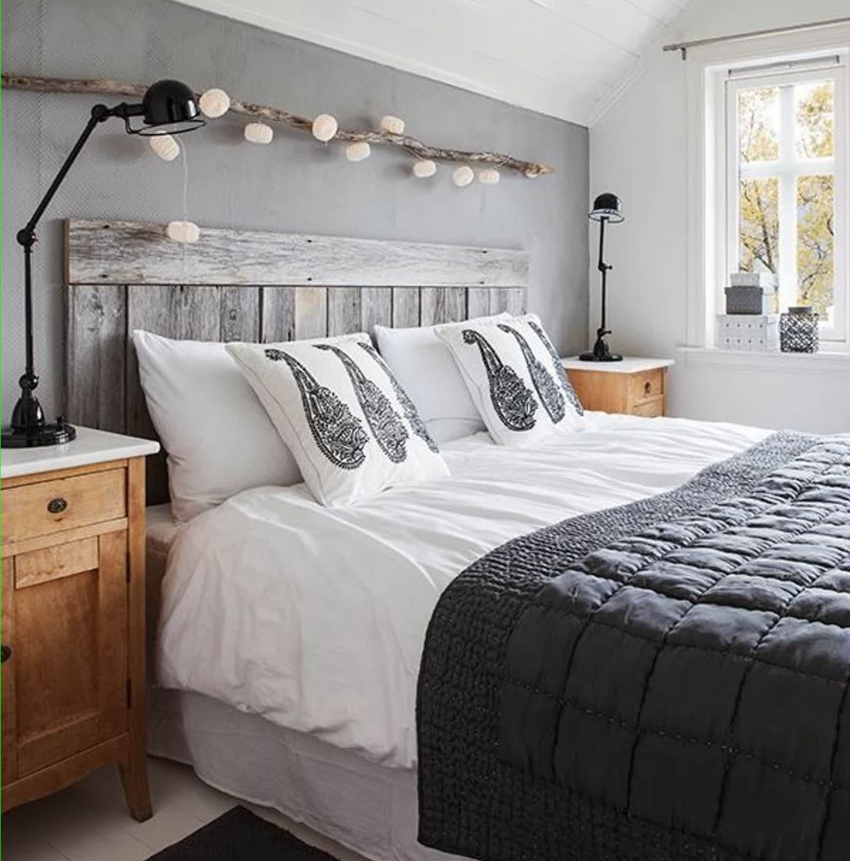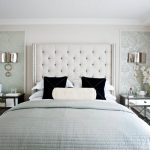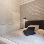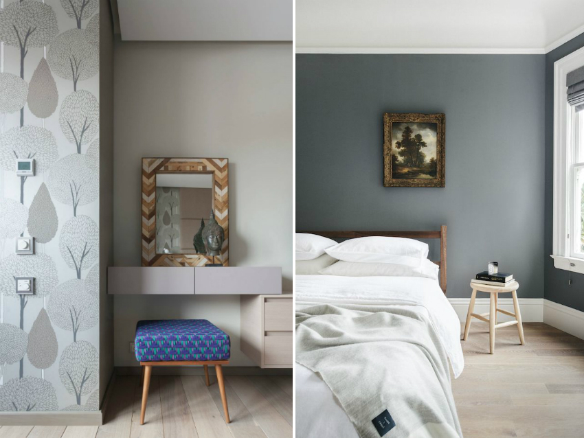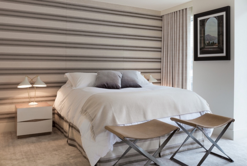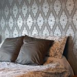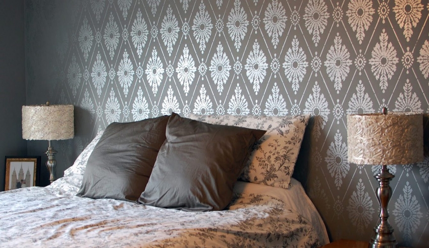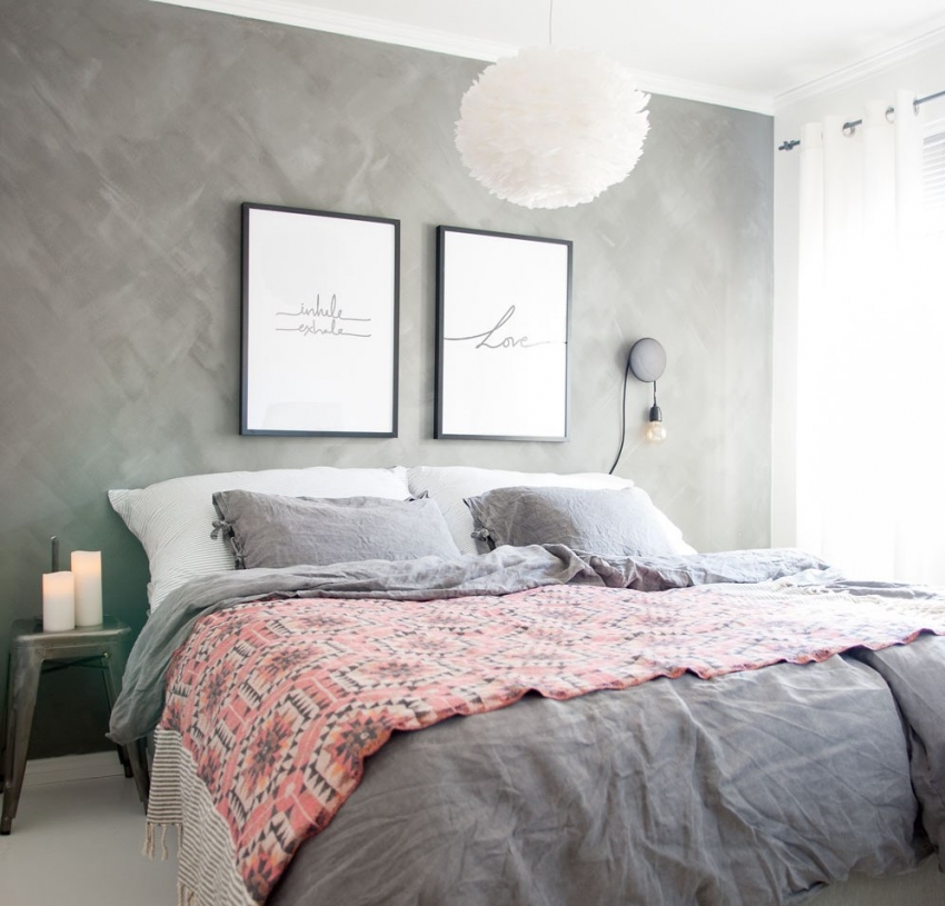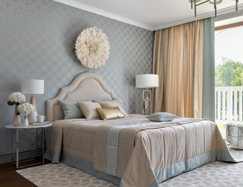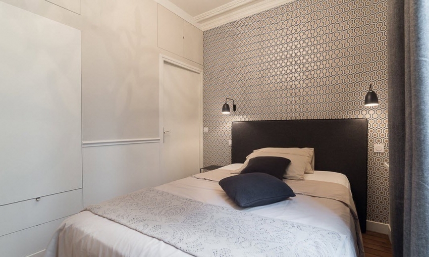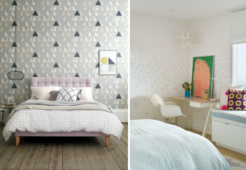 Untuk bilik tidur, anda boleh menggunakan kertas dinding dalam warna terang dengan corak atau hiasan kelabu.