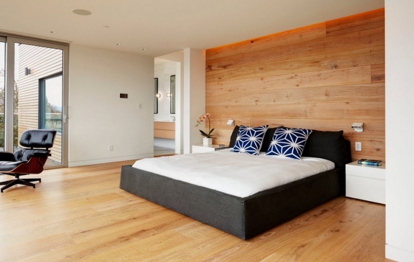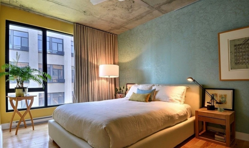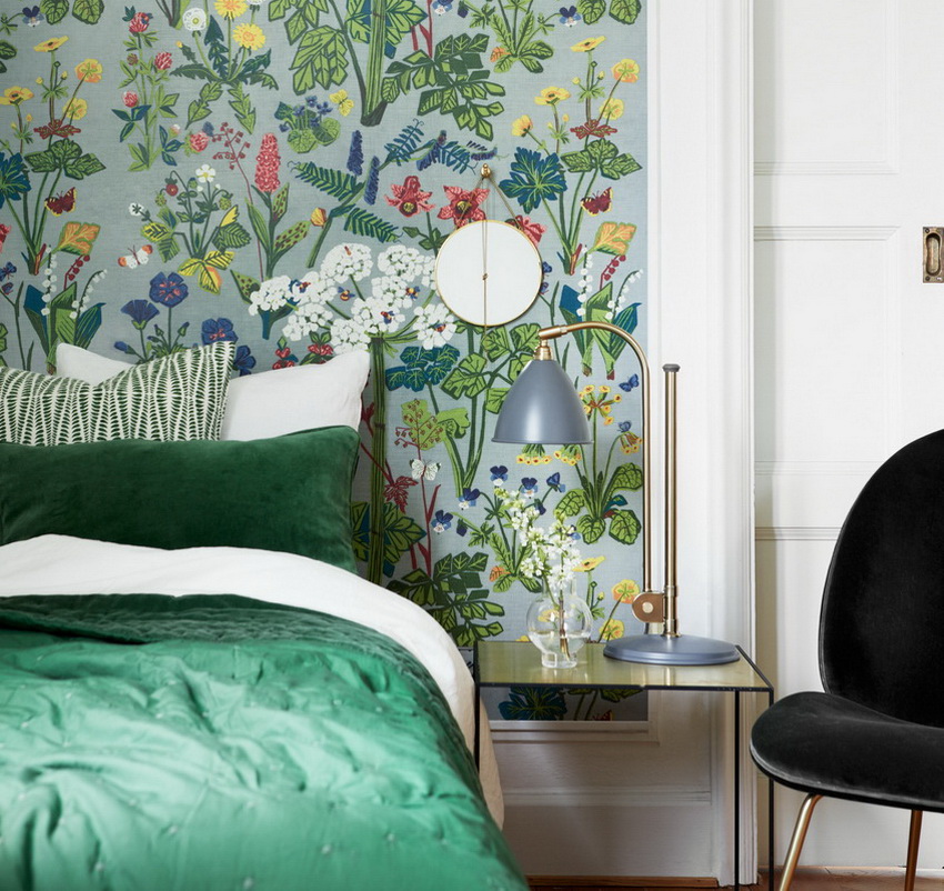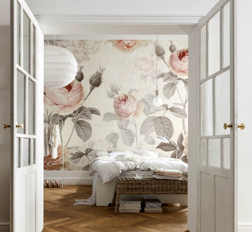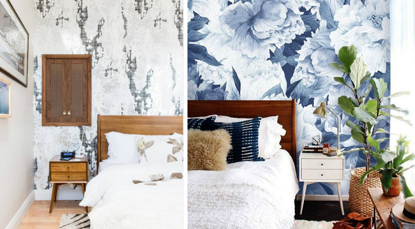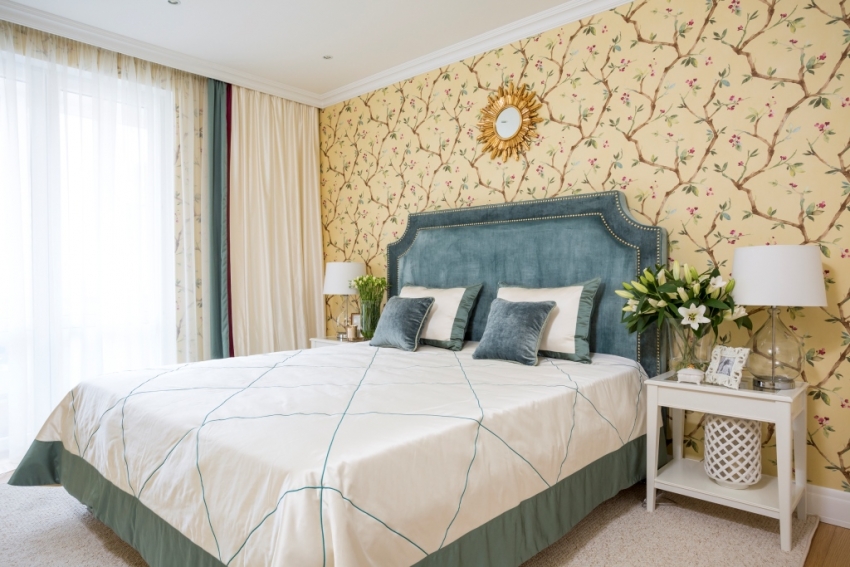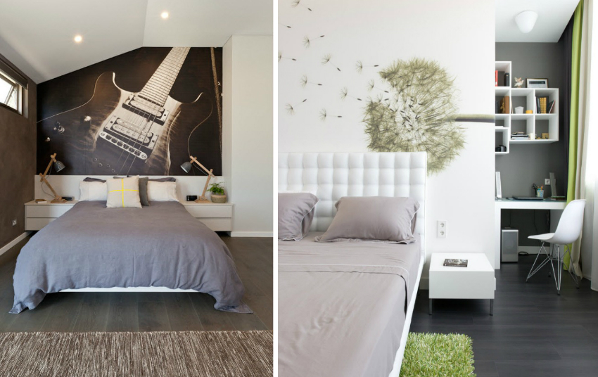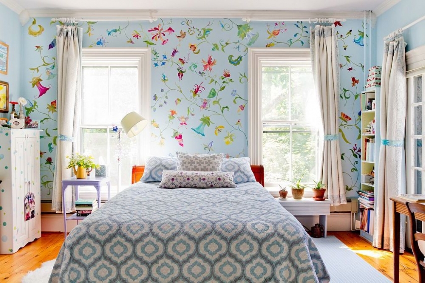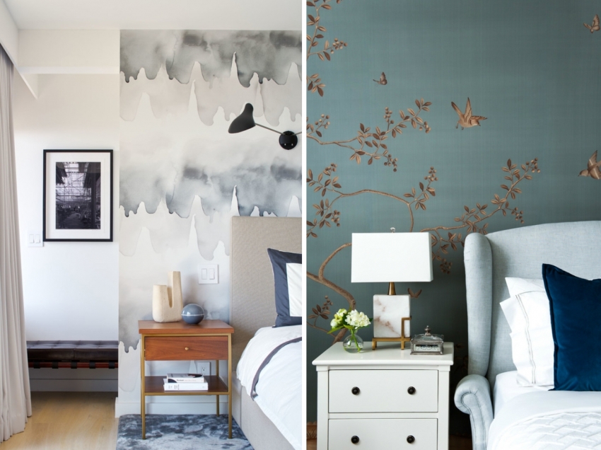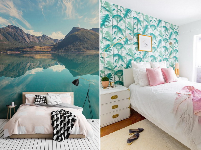 Untuk bahagian dalam bilik tidur moden, anda boleh menggunakan kertas dinding dengan lukisan cat air.