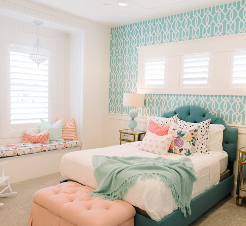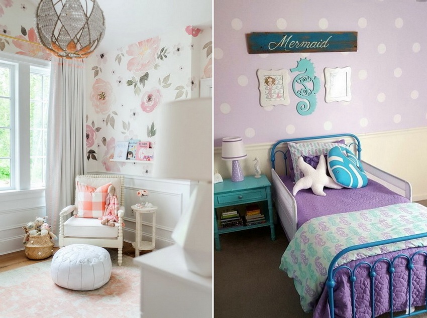 Sebagai hiasan, lebih baik bilik kanak-kanak perempuan membeli kertas dinding dengan warna terang, merah jambu, pic, kuning air dan ungu, serta warna pastel lain. Penggunaan oren, hijau yang diredam dan pirus dibenarkan. Dalam kes ini, tema bunga, gambar haiwan, gula-gula, huruf abjad, dan lain-lain sesuai. Penyelesaian gaya dalam bentuk bilik peri hutan atau puteri akan menjadi optimum.