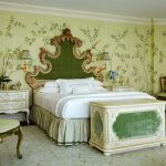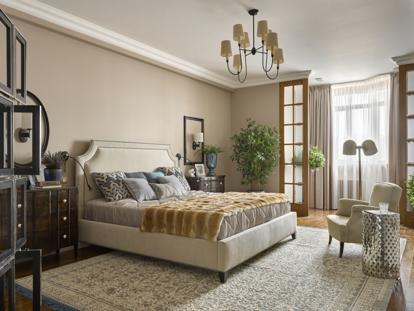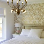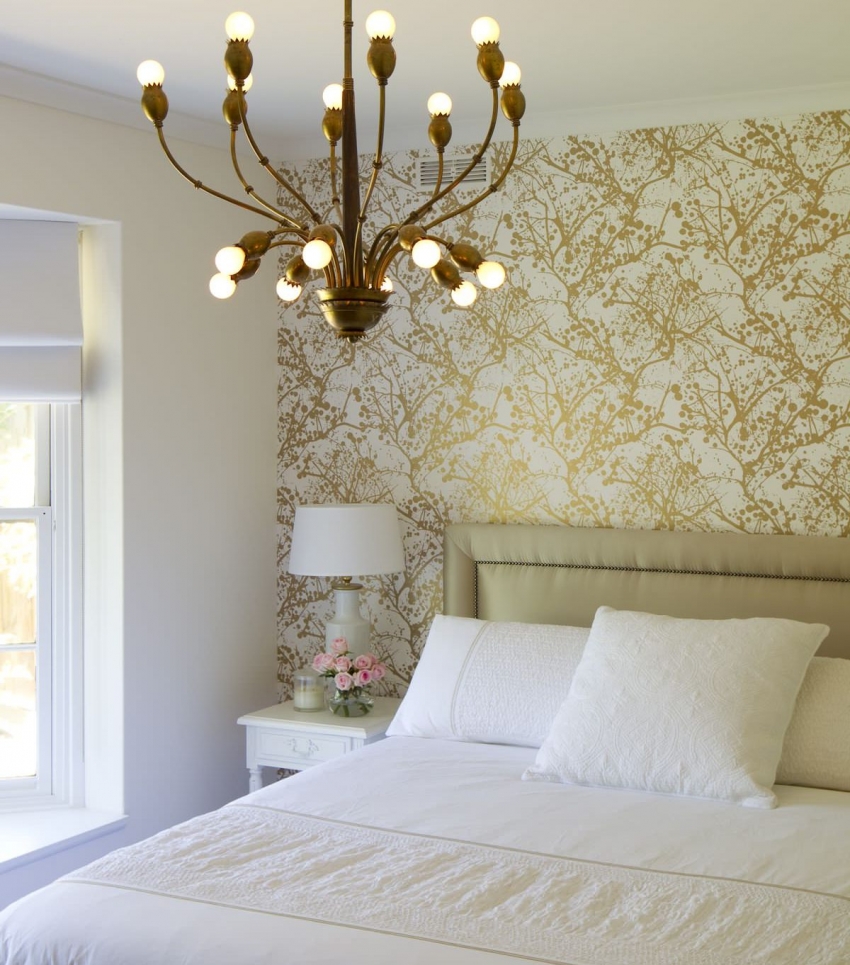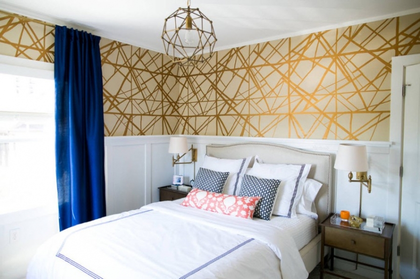 Selalunya, kertas dinding atau hiasan emas satu warna yang dihiasi dengan corak tebal digunakan untuk menghiasi bilik tidur.Bahan semacam itu dalam bentuk panel dibentuk oleh dinding yang terletak di belakang kepala katil, dan ruang yang tinggal ditampal dengan kemasan ringan. Dalam koleksi kertas dinding untuk bilik tidur dalam dua warna, yang paling berjaya adalah gabungan emas dengan bahan dalam warna krim atau putih.