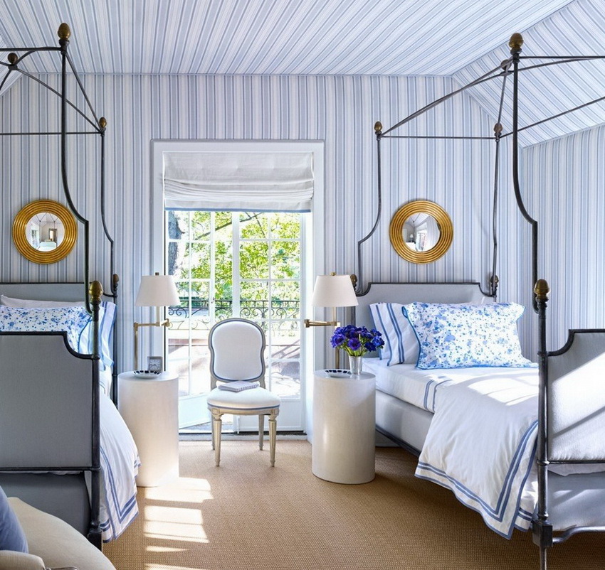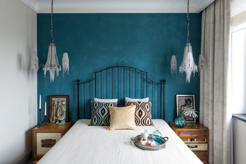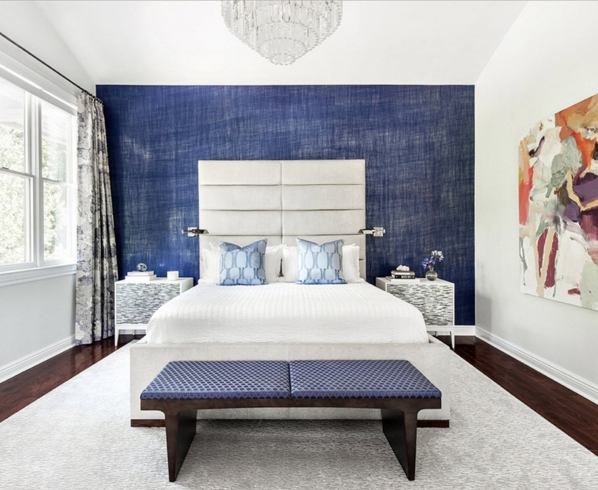 Kemasan biru kelihatan baik di bahagian dalam bilik tidur, yang memberi kesan menenangkan pada seseorang. Ia boleh digabungkan dengan warna kuning air, ungu, coklat gelap, putih dan kelabu. Penggunaan kertas dinding foto dibenarkan.