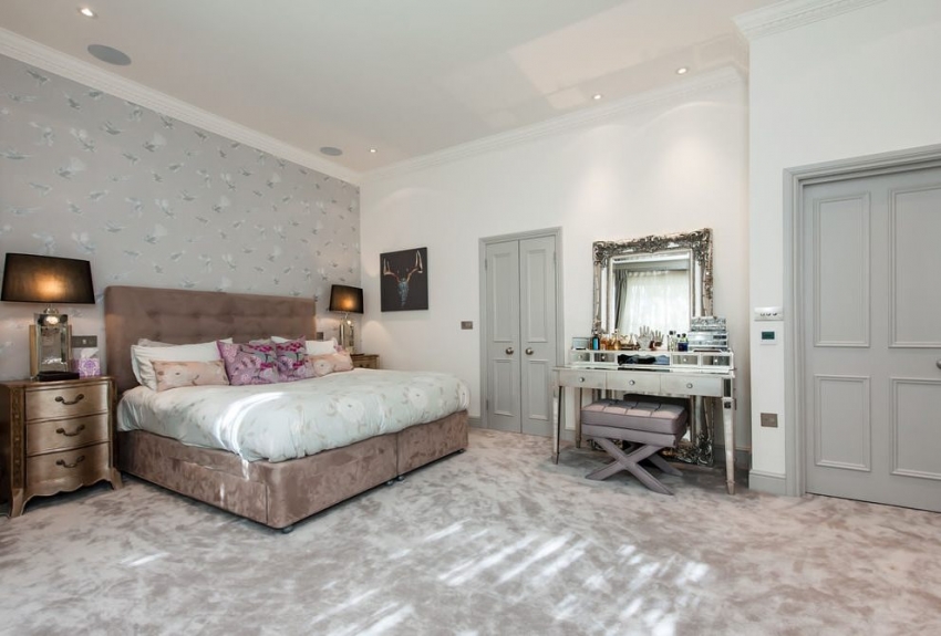 Untuk menghias dalaman yang cantik dengan warna kelabu di bilik tidur yang luas, disarankan untuk memilih bahan penamat yang dihiasi dengan hiasan hiasan dan gambar bersaiz besar. Penyelesaian yang menguntungkan ialah menggunakan kertas dinding dengan bunga untuk dinding, serta bentuk dan garis geometri. Penggunaan gambar dan cetakan abstrak dalam gaya klasik dibenarkan.