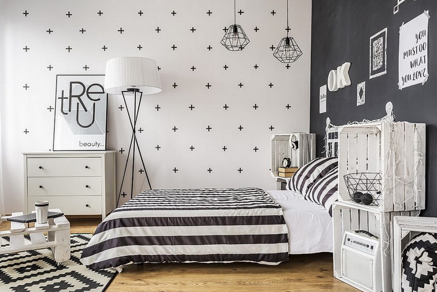 Kertas dinding hitam dan putih di pedalaman dan ciri penggunaannya