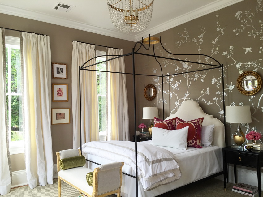 Kertas dinding dengan hiasan emas digunakan untuk menghias bilik tidur dengan gaya oriental atau klasik.