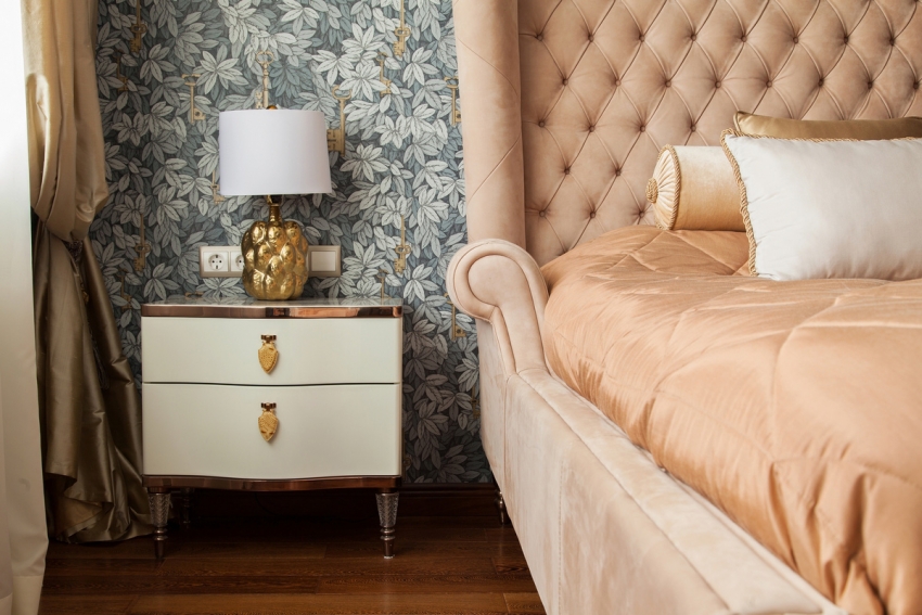 Nasihat berguna! Untuk bilik tidur dengan warna emas, gaya moden sesuai, yang boleh dibuat berdasarkan kertas dinding dengan corak abstrak atau bunga, serta barok dalam reka bentuk klasik.