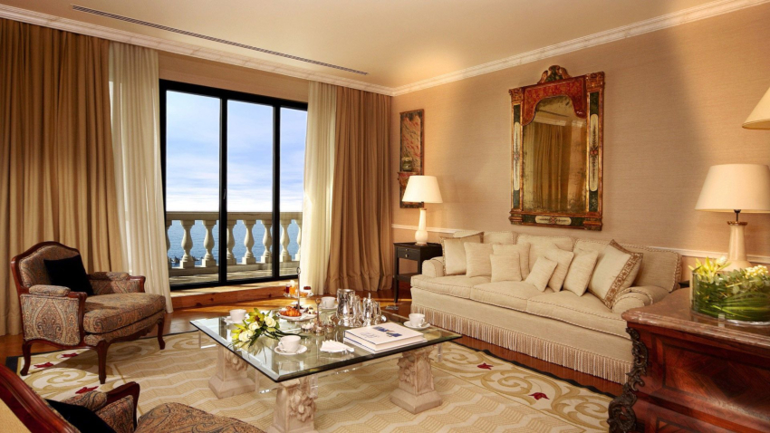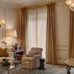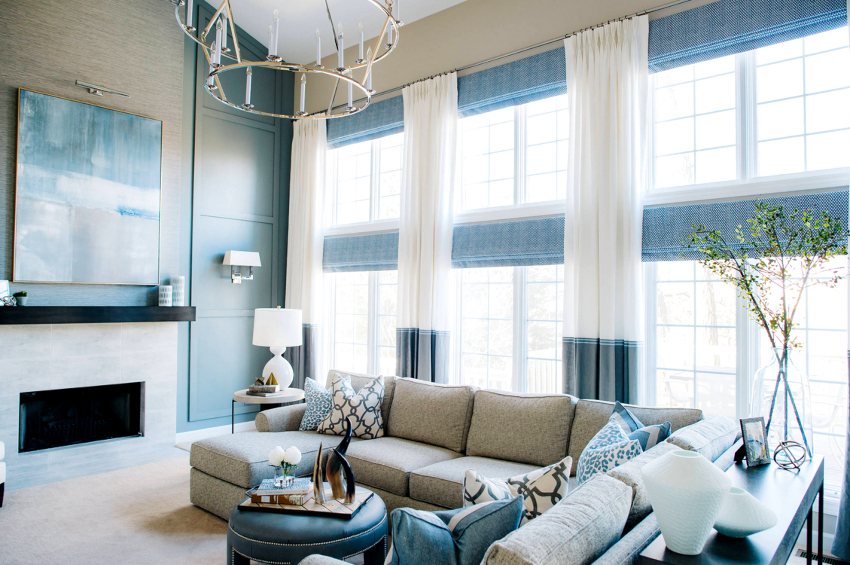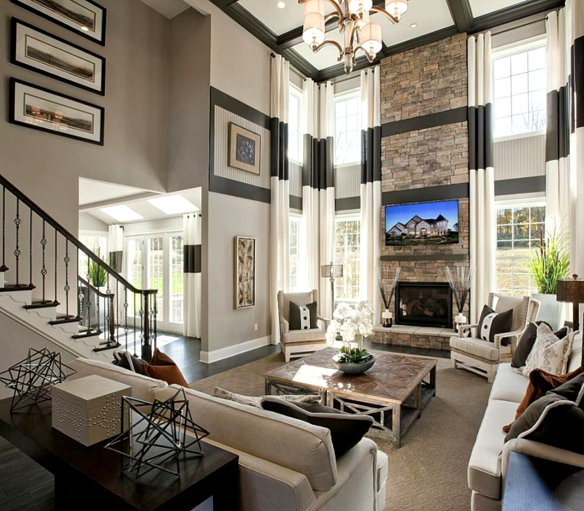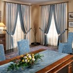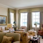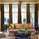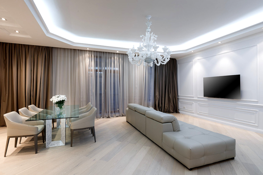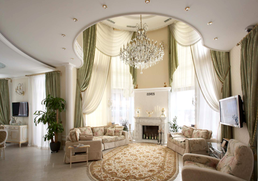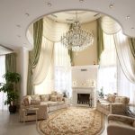 Semasa menghias reka bentuk tingkap di ruang tamu dengan langsir panjang, perlu memasang cornice pada ketinggian sekurang-kurangnya 300 cm