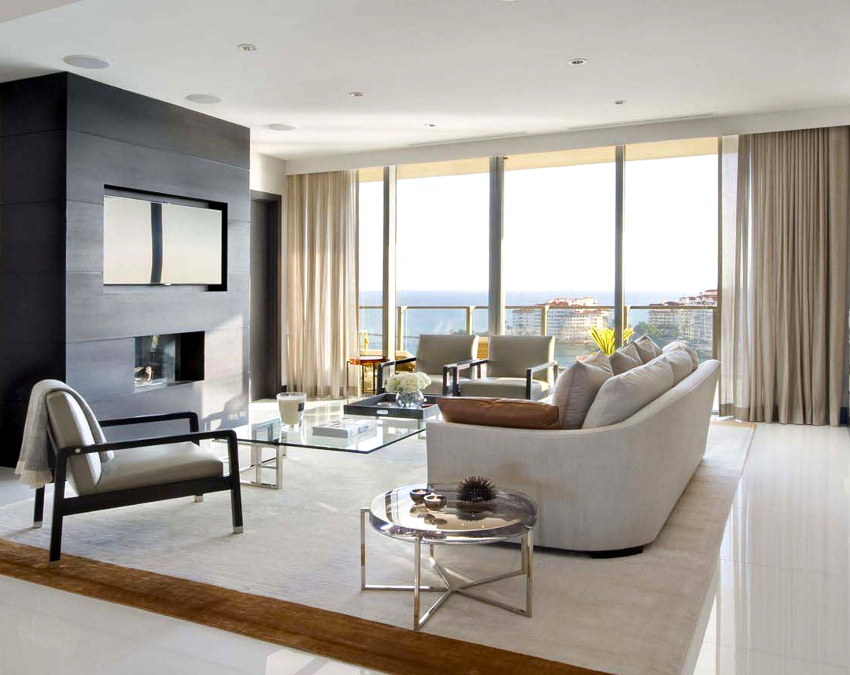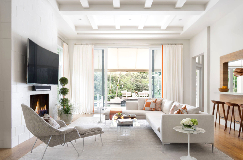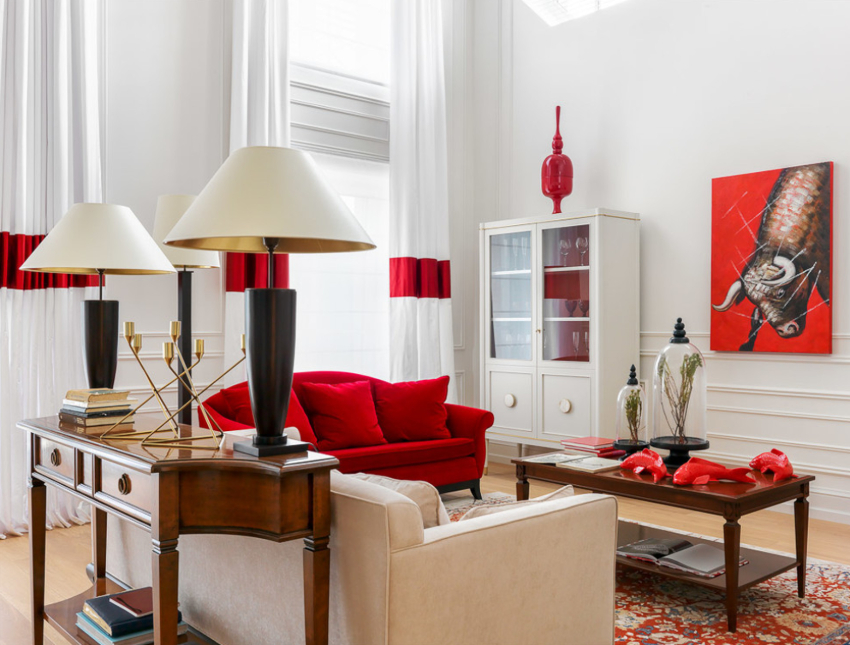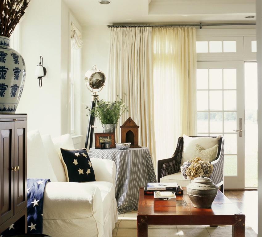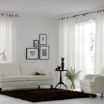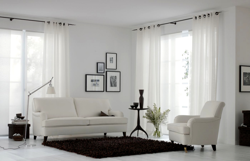 Tirai polos di ruang tamu putih boleh bergabung dengan dinding, dan tirai berwarna dapat menarik perhatian pada diri mereka sendiri