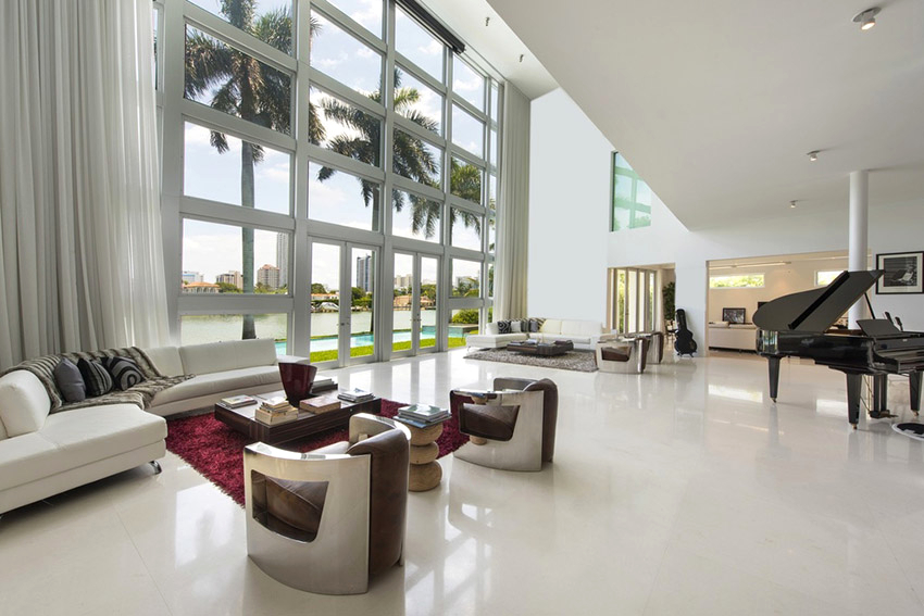 Ruang tamu dengan tingkap panorama dihiasi dengan indah dengan tirai filamen. Kawasan kaca besar menekankan keaslian mereka, menimbulkan rasa warna yang mengalir. Dengan latar belakang dinding, walaupun yang biasa, tirai seperti itu kelihatan kurang rapi dan asli. Penggunaan elemen hiasan tambahan untuk produk tersebut tidak diperlukan. Anda boleh membeli langsir siap untuk ruang tamu, dihiasi dengan manik-manik kaca atau lurex.