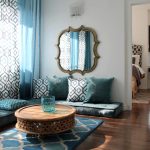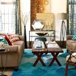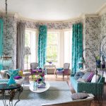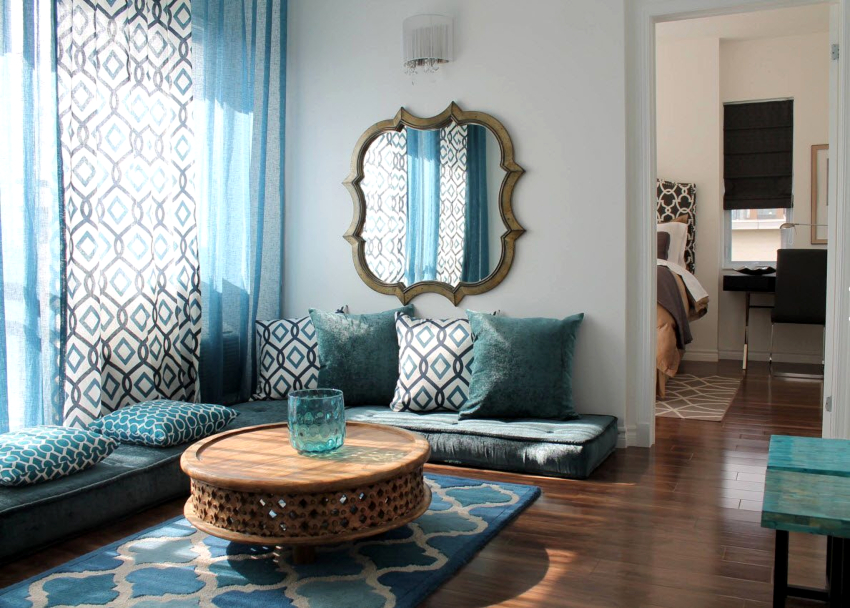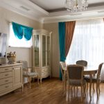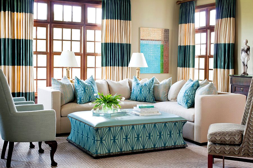 Tirai pirus yang digabungkan dengan hiasan emas atau coklat beige di bahagian bawah kanvas akan menghiasi bahagian dalam ruang tamu dengan cara yang asli. Tirai berat biru gelap akan menjadi lebih asli dengan hiasan atas pendek yang diperbuat daripada kain yang sama, dipangkas dengan baldu atau jalinan ringan.