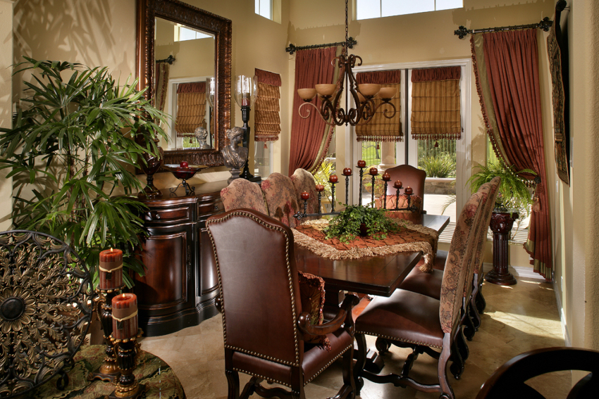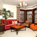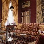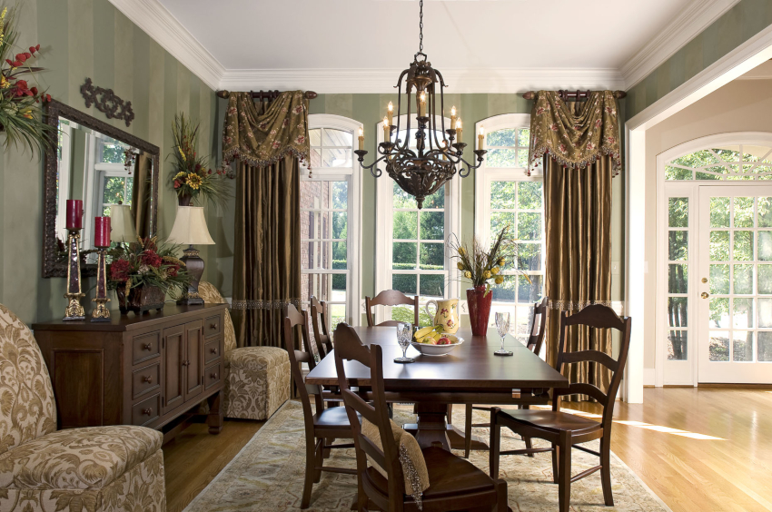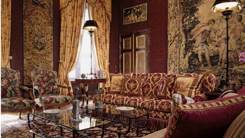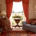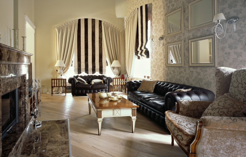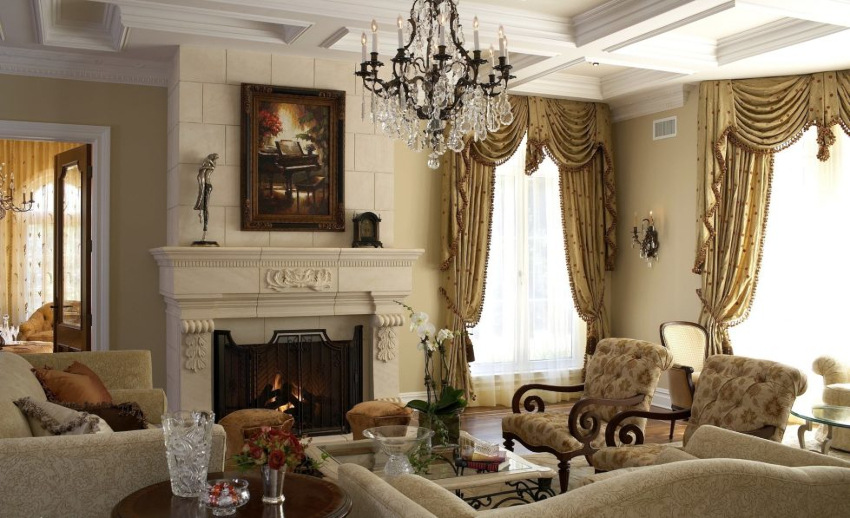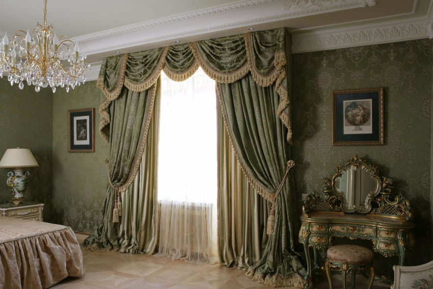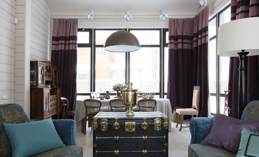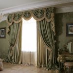 Bahagian dalam ruang tamu, dihiasi dengan tirai baldu, akan memperoleh hiasan yang kaya dengan kekangan