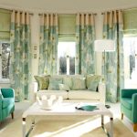Foto menunjukkan langsir hijau di bahagian dalam ruang tamu. Semua ini sesuai dengan perabot kayu dan dinding berwarna pistachio. Warna hijau produk tidak semestinya menunjukkan adanya perabot atau tekstil dengan warna yang sama di pedalaman. Tirai boleh digabungkan dengan tanaman hidup. Kawasan kejiranan ini melengkapkan dan pada masa yang sama menonjolkan elemen reka bentuk ini.