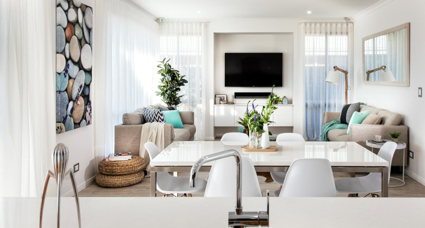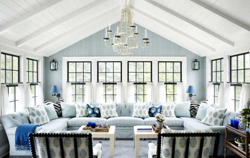 Abu-abu cetek, pistachio pucat, warna biru tulen akan mencerahkan bahagian dalam ruang tamu dengan warna putih yang sejuk.