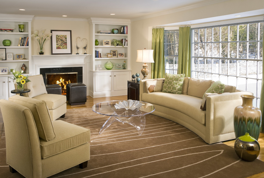 Tirai sesuai di ruang tamu dengan tingkap lebar dan rendah. Sekiranya bukaan seperti itu dihiasi dengan tirai panjang, mereka akan melabuhkan tirainya dengan ketara, yang akan menimbulkan perasaan tidak berguna, ketidaksesuaian begitu banyak tekstil.