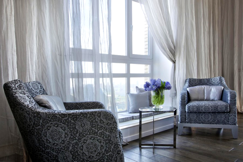 Semasa menghias tingkap di ruang tamu, banyak yang memilih kain ringan. Tulle, chiffon dan organza boleh digunakan sebagai bahan untuk menjahit langsir.