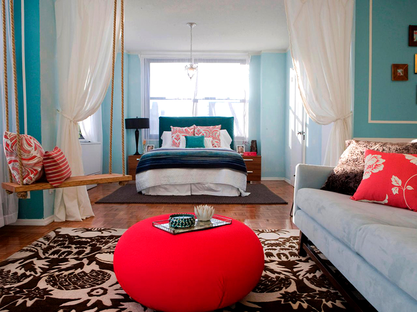 - pemisahan warna ruang bilik - perabot dan bahan penamat dari pelbagai warna akan secara visual membatasi bahagian fungsi bilik yang berbeza;