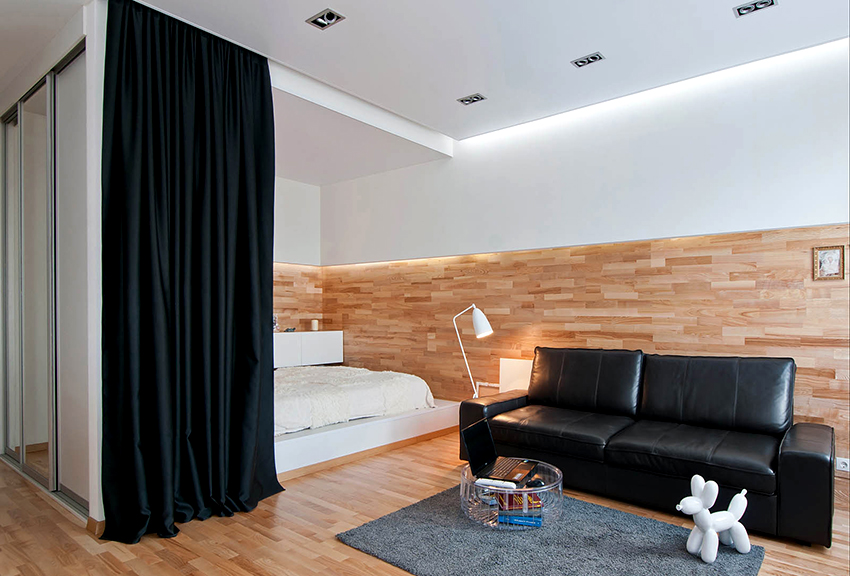 Ruang tamu dan bilik tidur dalam satu bilik: pengezonan ketinggian