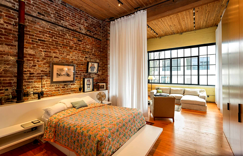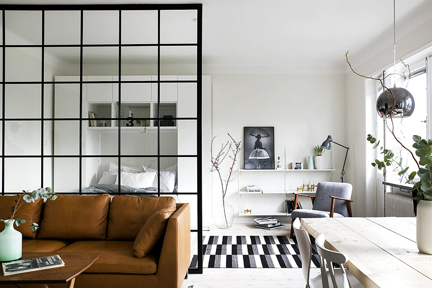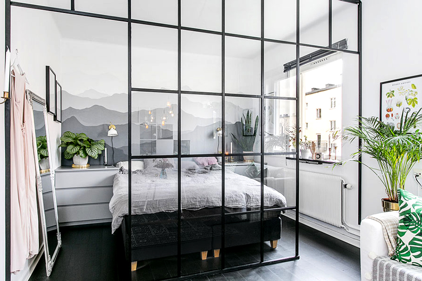Bilik tidur digabungkan dengan ruang tamu: pemisahan dengan partisi pegun dan bergerak