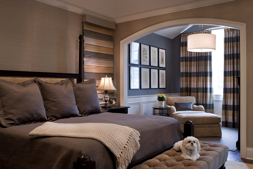 - Untuk kawasan bilik tidur, sudut paling jauh adalah yang terbaik. Dalam kes ini, anda boleh berehat dengan tenang di sini, walaupun seseorang berada di ruang tamu, kerana jumlah pergerakan di tempat ini akan dikurangkan minimum.