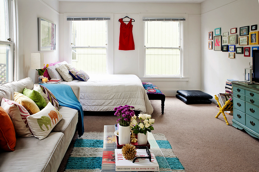- 6 Pengezonan warna: foto ruang tamu dan bilik tidur di ruang yang sama