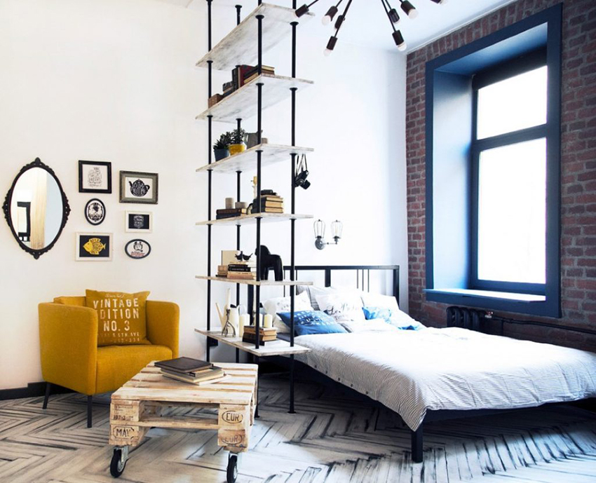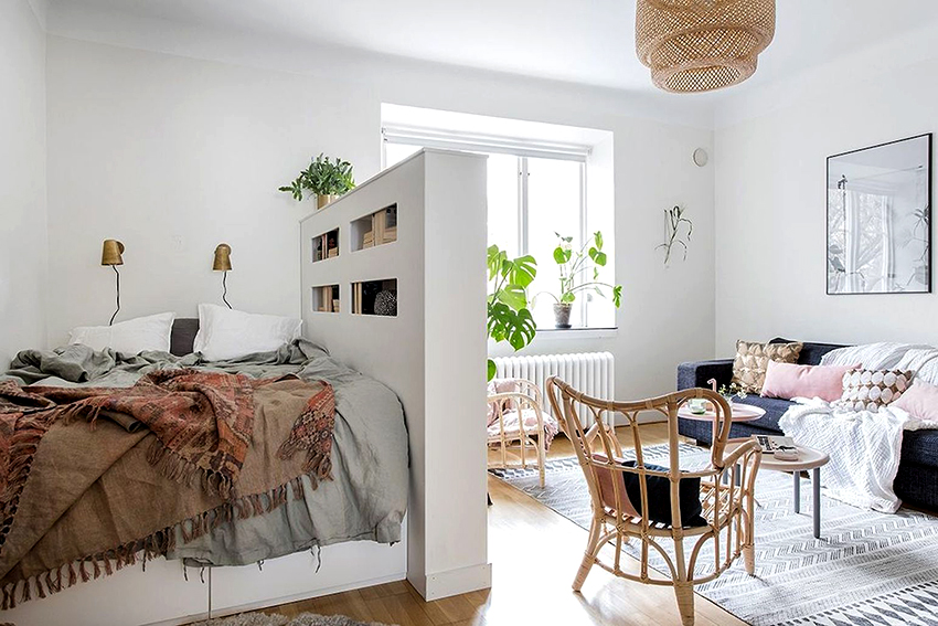 Untuk bilik tidur dan ruang tamu gabungan anda boleh menggunakan rak sebagai partition