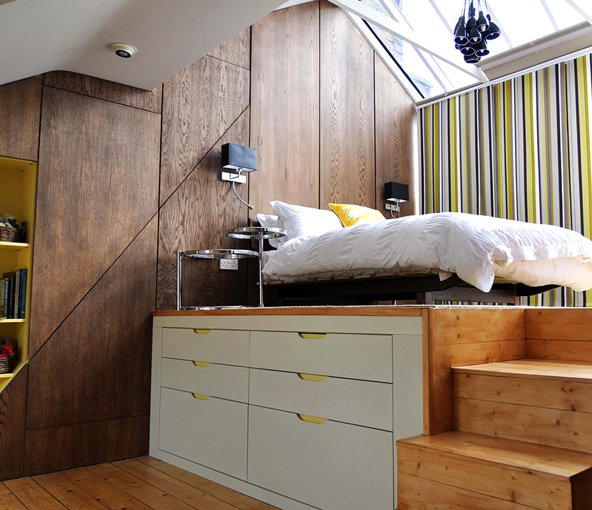 Di sebuah ruangan dengan siling rendah, para pereka telah menggunakan kaedah yang serupa: pada siang hari, tempat tidur dapat dinaikkan ke langit-langit, dan pada waktu malam dapat diturunkan dengan mekanisme automatik khas. Di tempat tidur, kawasan kerja disediakan pada waktu siang. Kelemahan pilihan pengezonan ini adalah kos yang tinggi.