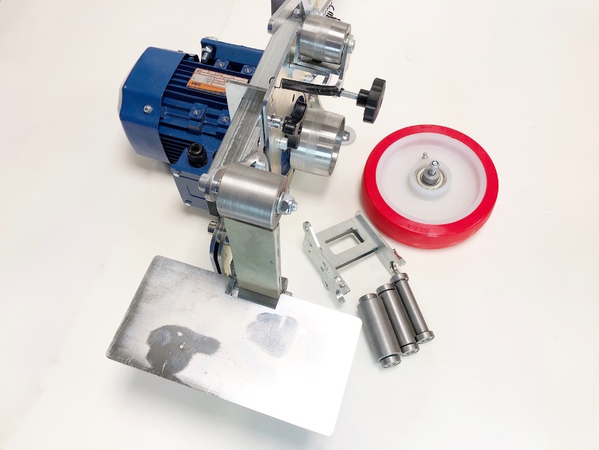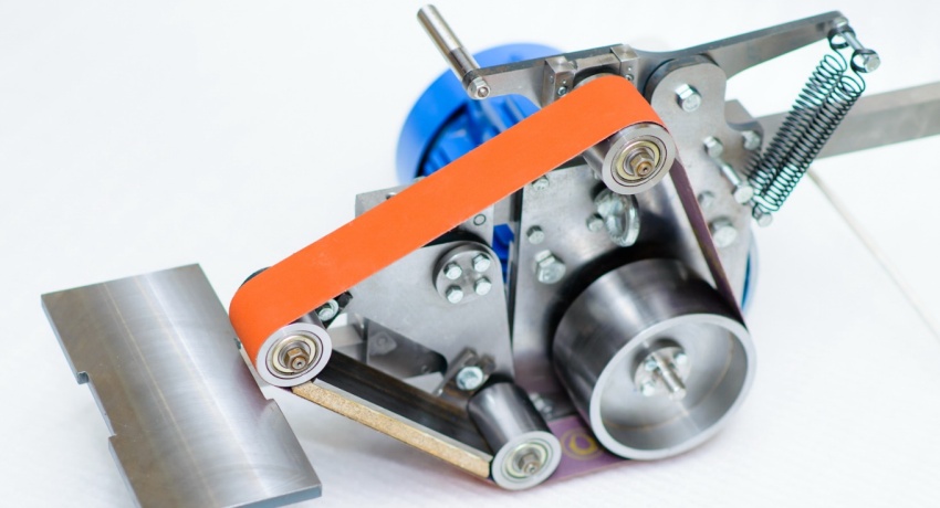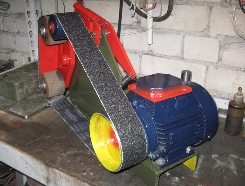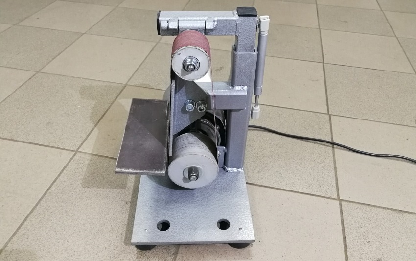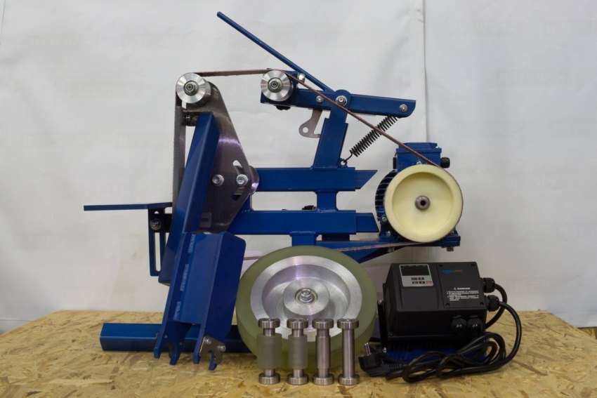 Ciri khas peranti seperti itu ialah ia mempunyai reka bentuk sederhana yang boleh diulang oleh sesiapa sahaja di rumah. Komposisi unit penggiling seperti motor elektrik, penggelek dan alat kerja itu sendiri - tali pinggang dengan lapisan kasar. Jalur boleh mempunyai ukuran butiran yang berbeza. Penunjuk ini dipilih sesuai dengan tujuan alat.