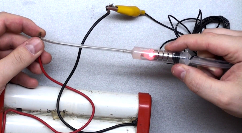 Sekiranya anda menjalankan penunjuk di sepanjang kabel di bawah plaster, LED juga akan menyala. Dalam kes ini, sangat mustahak untuk memastikan hubungan dengan titik atas. Sekiranya pemutar skru dipindahkan 2-3 cm berbanding wayar, ia akan keluar.