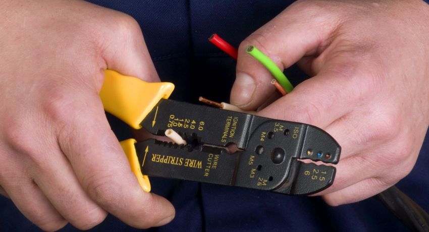Tang untuk mengepit lug kabel. Tujuan berfungsi. Alat profesional dan isi rumah. Tang hidraulik. Crimper untuk mengepit kabel internet.