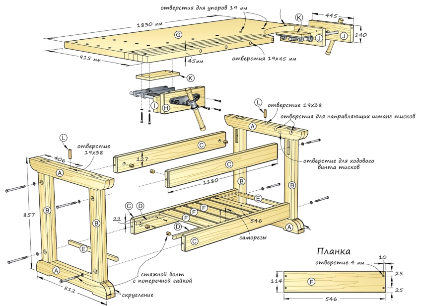 Catatan! Pasti terdapat lubang di meja meja kerja yang akan digunakan untuk memasang pengapit dan berhenti. Tanpa alat ini, mustahil untuk melakukan kerja pertukangan.