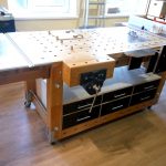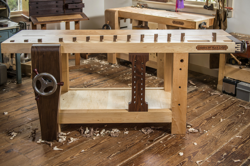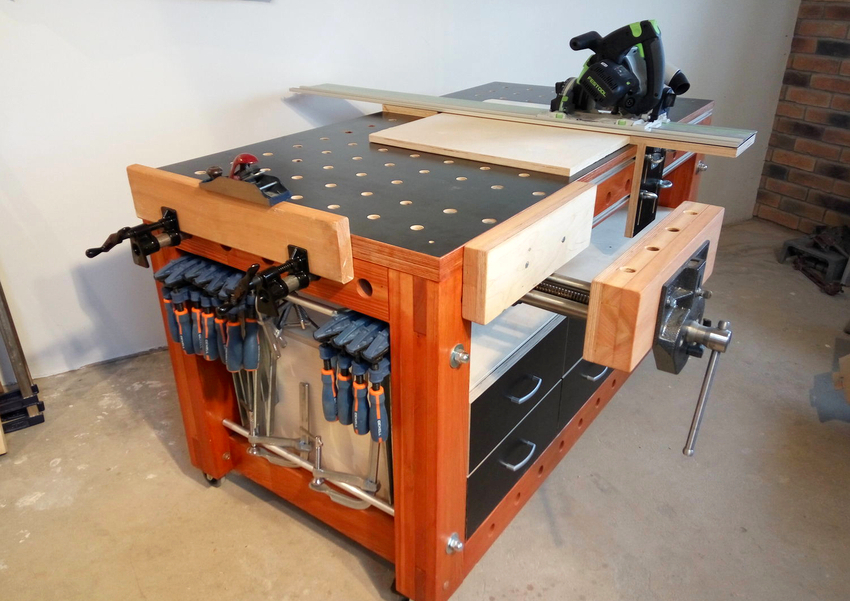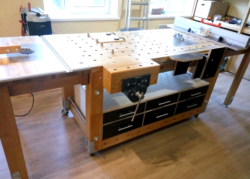 Bangku kerja gabungan menggunakan asas kayu dan logam lembaran untuk mengukuhkan permukaan kerja. Di samping itu, reka bentuknya mengandungi sisir logam, serta skru berulir. Peranti gabungan merangkumi meja logam dengan laci dan rak alat yang diperbuat daripada kayu.