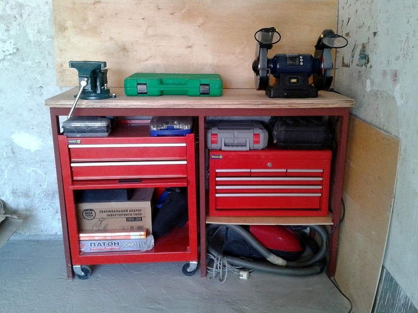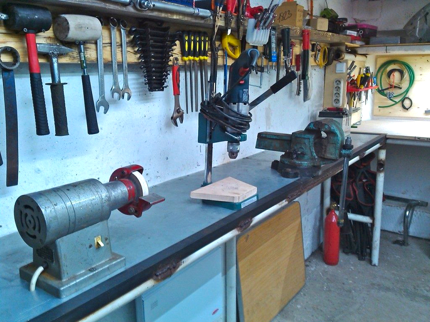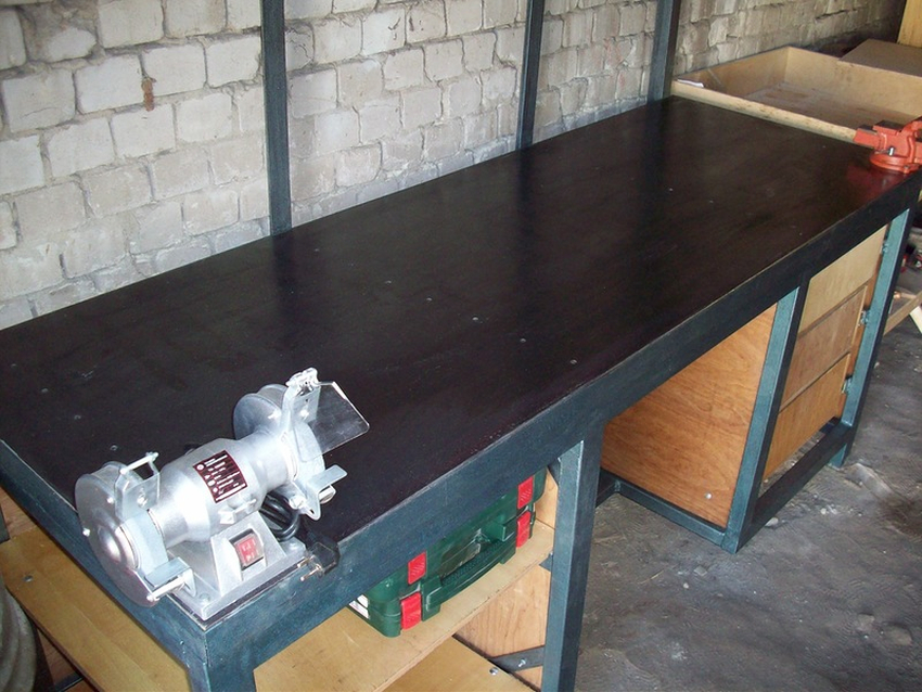 Memasang meja tukang kunci di garaj boleh dipanggil penyelesaian sejagat. Dalam kes ini, permukaan kerja diperbuat daripada logam, supaya tuan dapat bekerja dengan selamat menggunakan bahan berat dan keras.