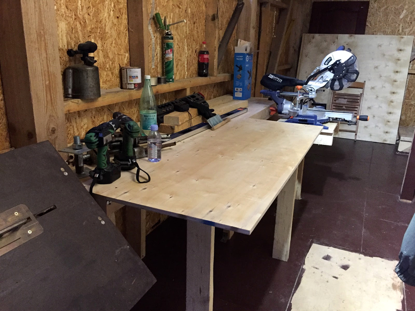 Setelah membuat bingkai bahagian meja kerja, permukaan kerja dipasang dari papan dan selembar papan lapis