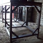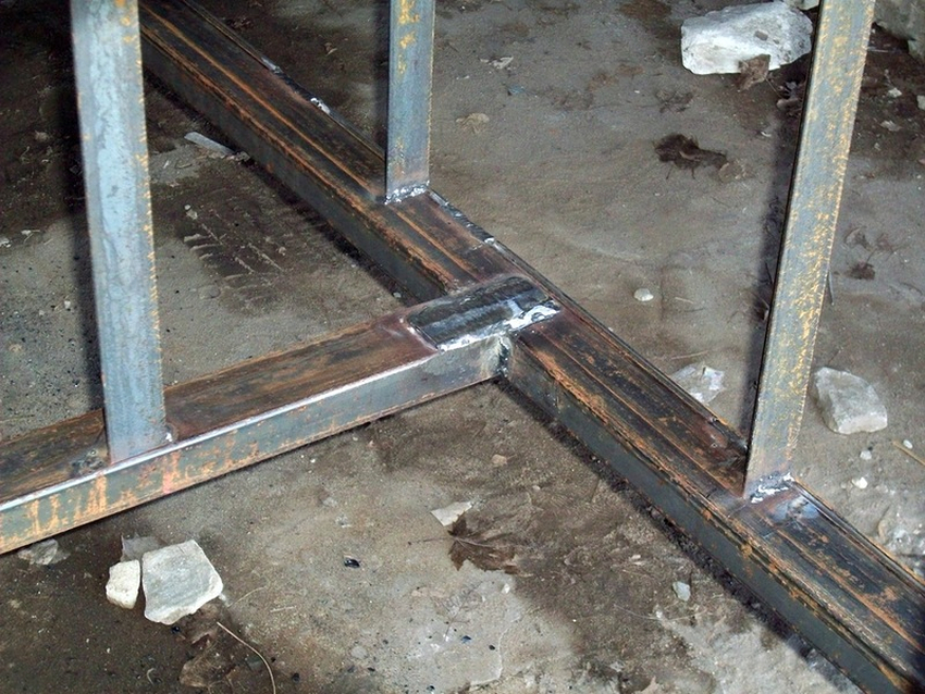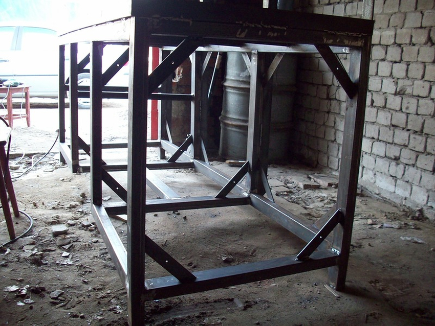 Kemudian anggota silang dibuat. Mereka dikimpal secara mendatar di bahagian bawah kaki sokongan. Untuk mengukuhkan struktur, pendakap pepenjuru harus dipasang di bahagian belakang meja. Di bawah kotak, yang boleh dibuat dari bahan yang ada, anda perlu mengimpal bahagian melintang dan sudut membujur.