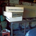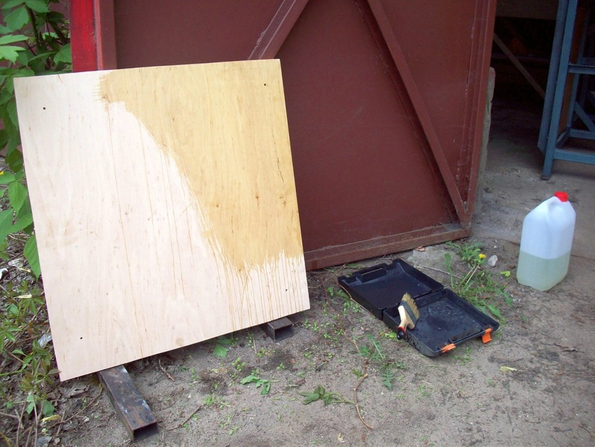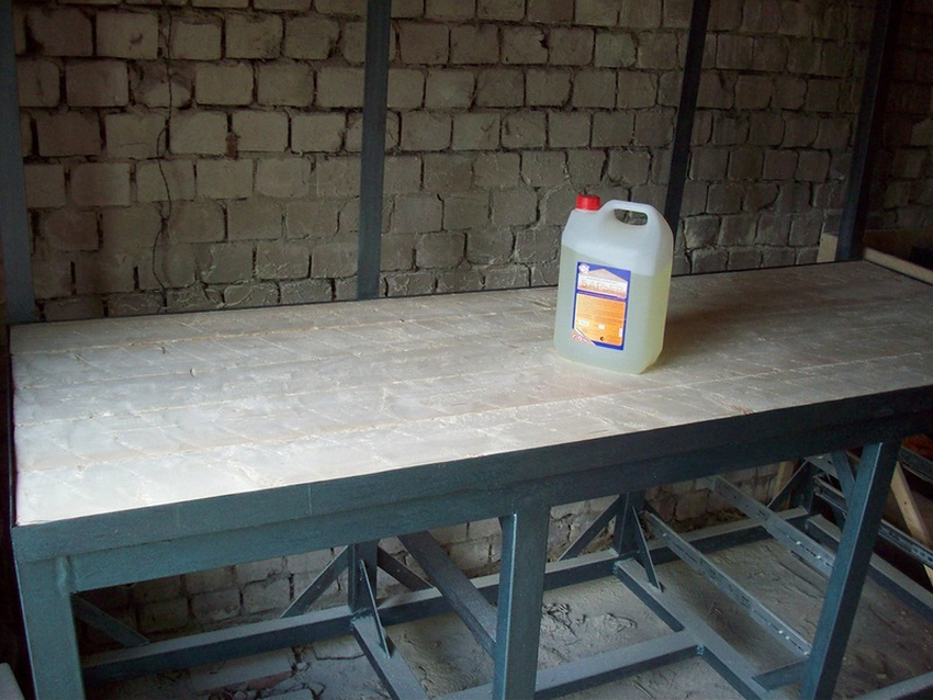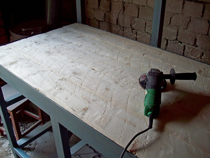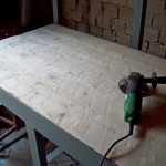 Apabila bahagian bingkai siap, permukaan kerja dipasang dari papan dan selembar papan lapis. Kanvas yang dihasilkan disesuaikan dengan dimensi meja kerja, diratakan dan diproses dengan gam kayu. Setelah pengeringan lengkap, ia dipasang dengan kuat pada bingkai dengan skru mengetuk sendiri.