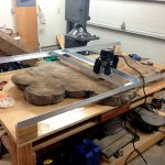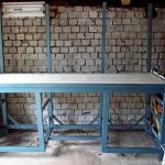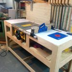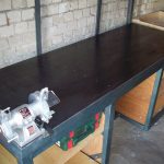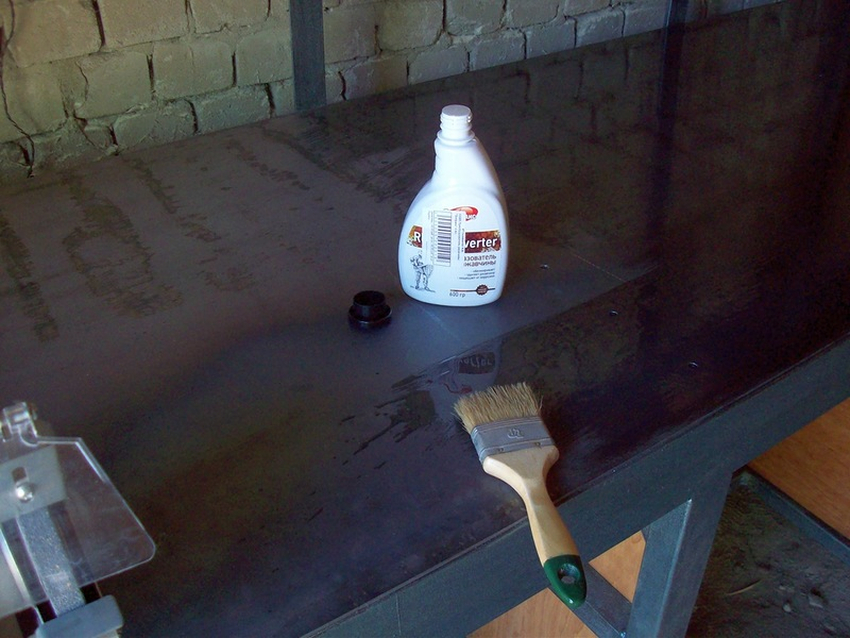 Alat kuasa dipasang di satu sisi meja kerja.Tepi permukaan kerja ini harus menonjol dari bingkai sekitar 20-30 cm. Sekiranya permukaan kerja diperbuat daripada kayu, ia harus dilindungi dengan kepingan logam. Keluli tahan karat dengan ketebalan 1.5-2 mm sangat sesuai untuk tujuan ini. Walaupun kepingan keluli biasa dengan ketebalan 1.5 mm akan lebih murah.