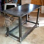 Pertama sekali, untuk membuat meja kerja di garaj dari logam dengan tangan anda sendiri, anda perlu memotong bingkai kosong untuk kanvas atas. Di meja tukang kunci, lebih baik membuat permukaan kerja dari keluli lembaran dengan ketebalan sekurang-kurangnya 0,5 cm. Di permukaan, sesuai dengan gambar, sudut dipasang, yang kemudiannya akan digunakan untuk memperbaiki dasar meja. Sebelum elemen-elemen ini akhirnya diamankan dengan pengelasan, elemen-elemen tersebut mesti diselaraskan di sudut dan diikat dengan penjepit. Selepas itu, jahitan penyambung dibersihkan dengan teliti.