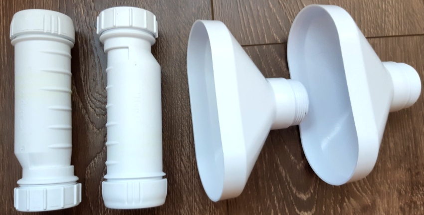 Diameter segel hidraulik mungkin tidak sesuai dengan ukuran paip cawangan pada titik sambungan ke paip pembetung. Dalam kes ini, anda boleh menggunakan penyesuai dalam bentuk cincin plastik yang mempunyai dua diameter yang berbeza, salah satunya mesti sesuai dengan ukuran meterai air, dan yang kedua dengan parameter saluran pembuangan. Untuk sambungan yang selamat, cincin O harus dilapisi dengan sealant silikon.