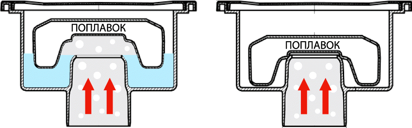 Model float berfungsi berdasarkan prinsip flush tank. Reka bentuknya adalah kaca ringan terbalik dengan tepinya terendam di dalam air. Float ringan diletakkan di permukaan air. Setelah mengurasnya, tenggelam, ia menyekat saluran pembuangan. Dalam beberapa model, bukannya pelampung, bola cahaya dipasang, yang, setelah aliran keluar cecair, jatuh ke tempat duduk luar, memastikan lubang saliran tertutup rapat. Pilihan ini boleh dibuat secara bebas semasa mengatur pendawaian kumbahan di tempat mandi.