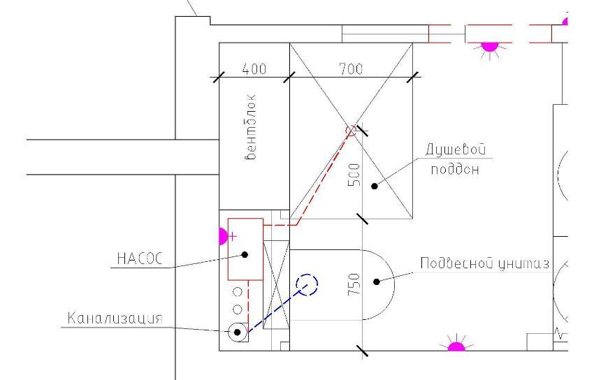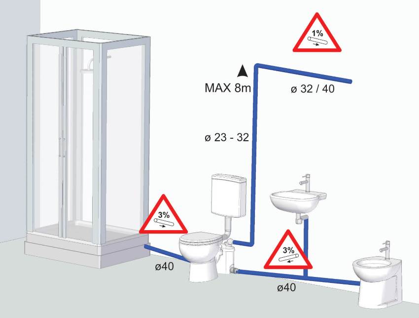 Penting! Sekiranya pancuran disambungkan ke sistem, saluran paip diletakkan dengan kemiringan 1%. Arahan pemasangan untuk Sololift 2 WC-3 membolehkan pemasangan mangkuk tandas dan 3 titik penggunaan air yang lain. Walau bagaimanapun, tidak ada satu modifikasi yang membolehkan anda menyambungkan beberapa tandas ke sistem, kerana agar sistem kumbahan berfungsi dengan betul, salur masuk lebih besar dari 10 cm diperlukan.