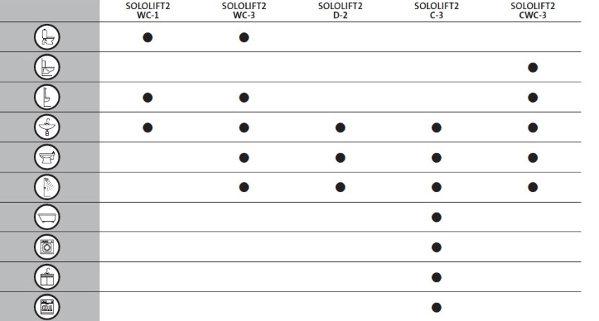 Oleh kerana saiznya yang padat, peralatan jenis ini dapat dipasang di kamar dengan area kecil, jadi disarankan untuk membeli Sololift untuk bilik mandi, tandas atau dapur. Reka bentuk khas dengan landai yang landai menghalang pembentukan lumpur dalam bentuk kumbahan dan najis. Peralatan yang disertakan meningkatkan kadar bekalan bendalir, yang menyebabkan draf pusaran muncul di dalam sistem, menghilangkan sedimen dari dasar tangki.