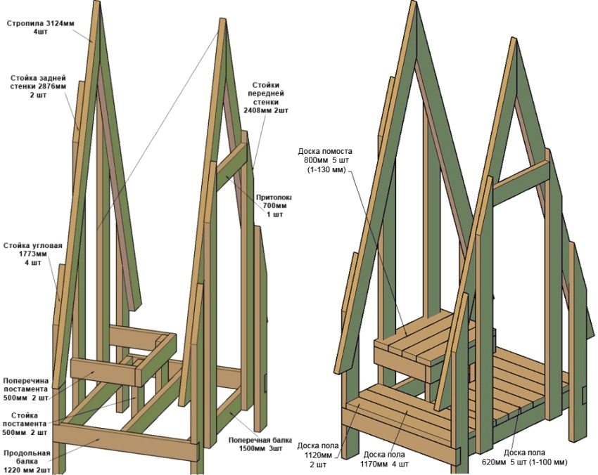 - pembinaan bahagian atas tanah (bingkai yang diperbuat daripada kayu), penamatnya. Papan kayu atau lapisan boleh digunakan sebagai bahan pelapis bingkai. Lantai diperbuat daripada papan tebal. Ketebalan minimum untuk penutup lantai adalah 4 cm. Dianjurkan untuk menggunakan spesies kayu dengan ciri kekuatan yang meningkat. Spesies ini termasuk larch, beech, oak, dll.