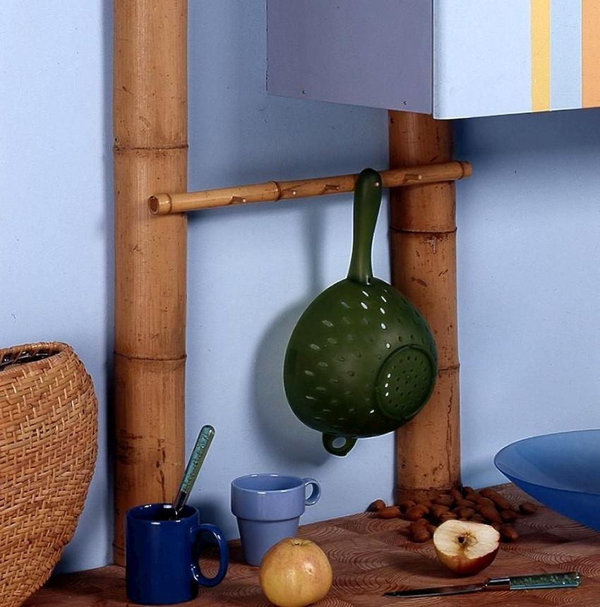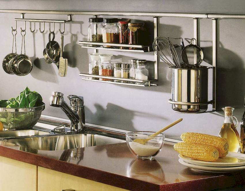 Rak, cangkuk dan semua jenis pemegang adalah bahagian penting dari dapur, yang membolehkan anda menjadikan bahagian dalamnya lebih berfungsi. Mengikut keperluan keselamatan, tidak ada yang boleh digantung di paip gas. Walau bagaimanapun, dengan bantuan pagar, anda dapat membuat ilusi, berkat komunikasi yang sepertinya menjadi sebahagian daripada gambaran keseluruhan. Untuk ini, paip dicat dengan warna yang sedekat mungkin dengan naungan pagar. Selalunya, warna tembaga, gangsa digunakan untuk ini, serta warna yang meniru permukaan krom.